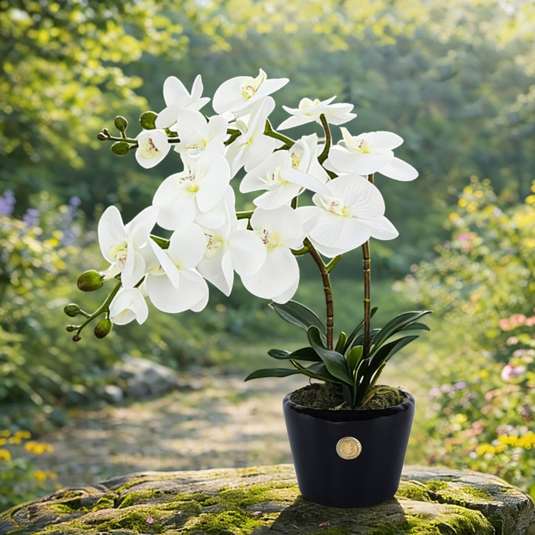 Stylish living room interior displaying design service sign