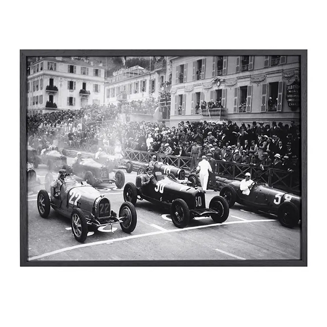 Framed Porsche logo with black and beige bordersStylish living room with framed car brand posters