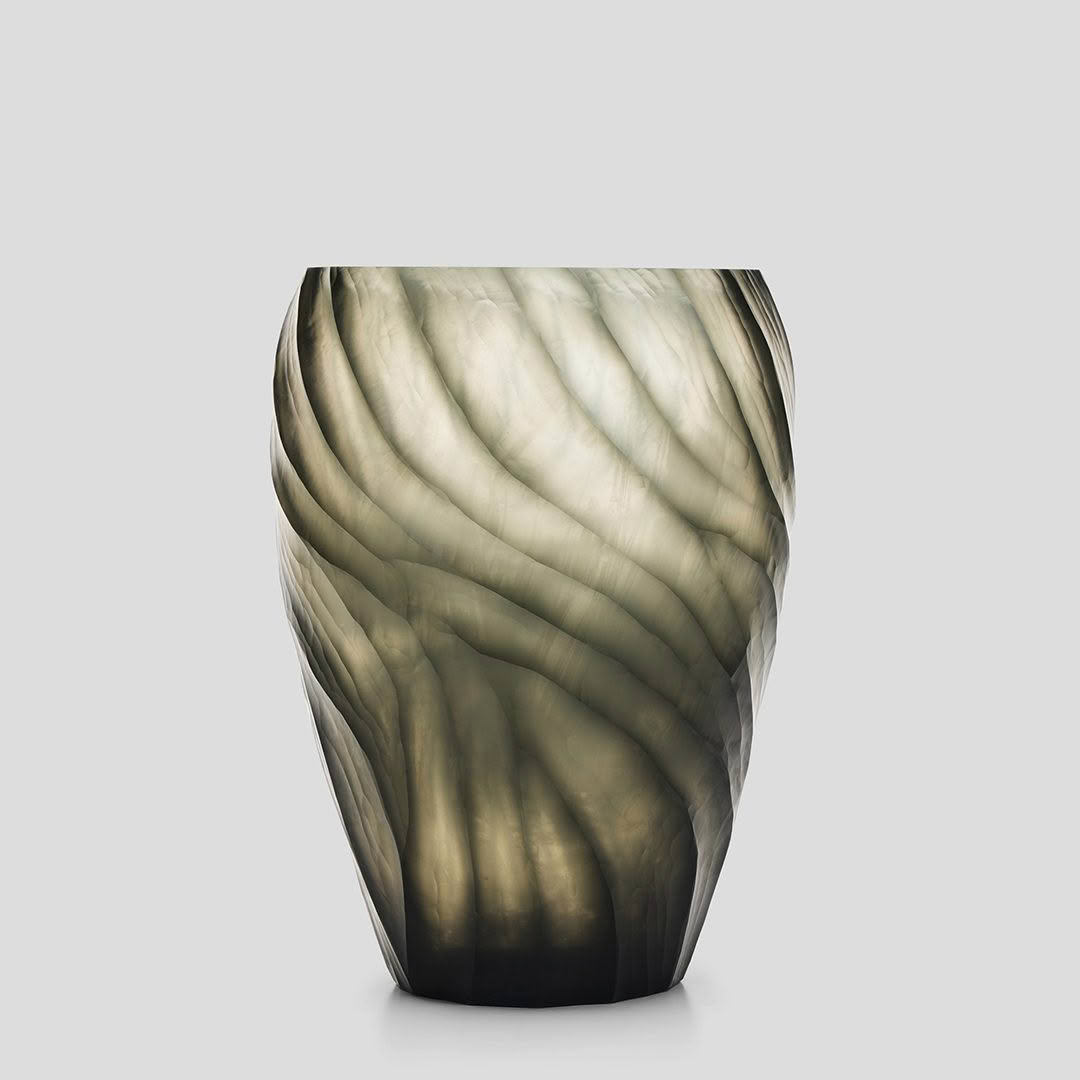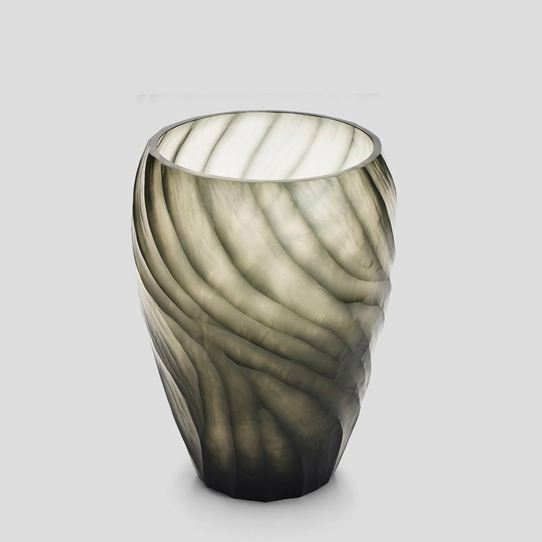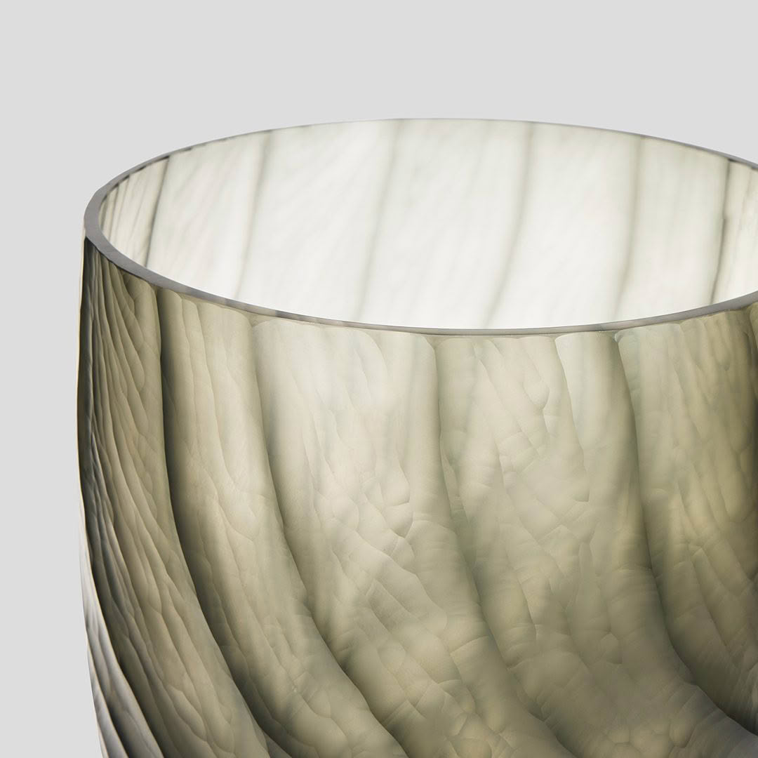 The Corva vase is crafted in glass with a flowing, wavelike form inspired by movement beneath the surface. Soft undulations rise organically, creating depth and a subtle play of light. Sculptural and serene, it brings quiet elegance to any space.