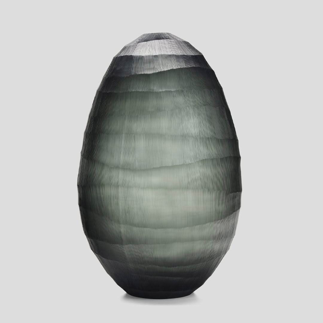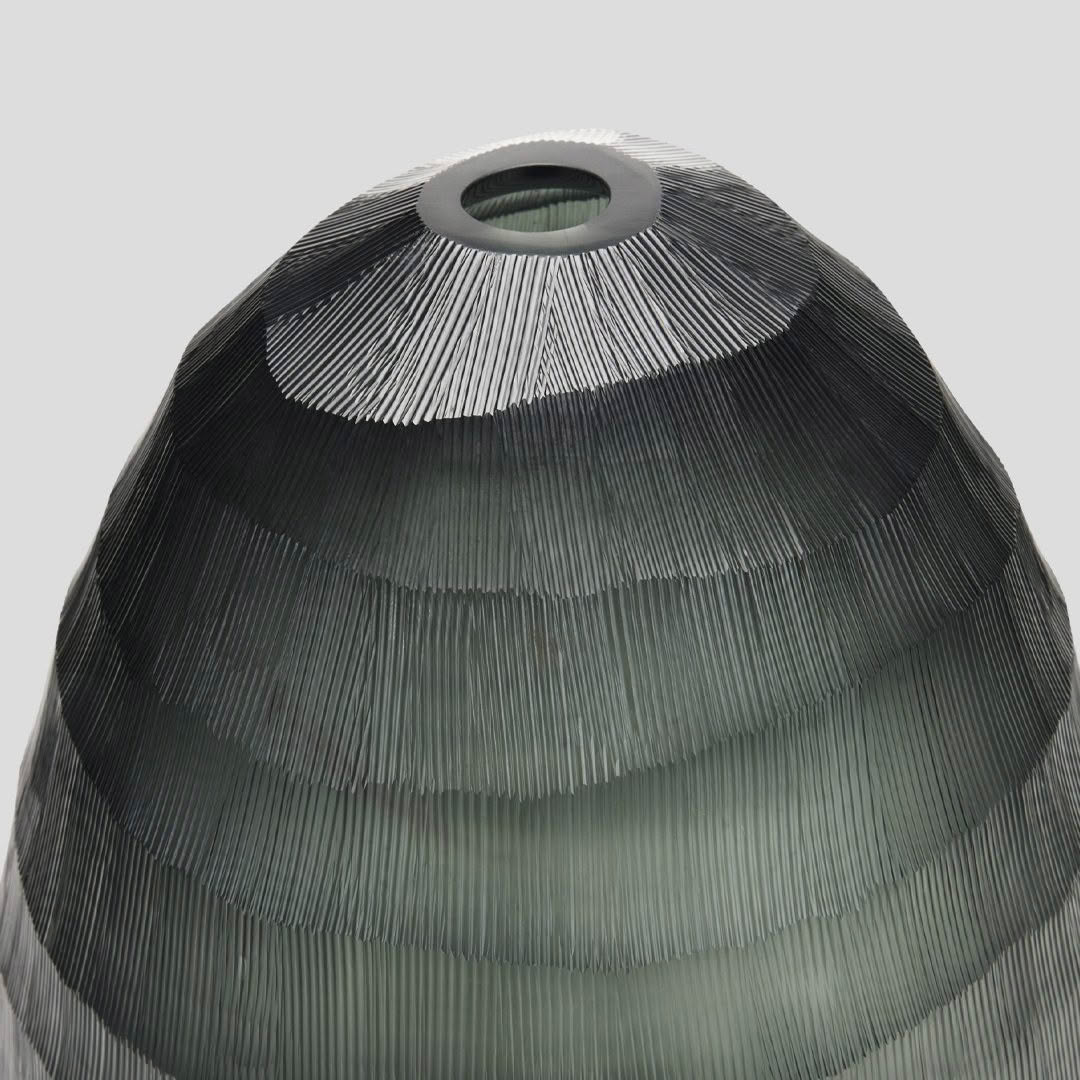 The Orena vase in Olive is defined by horizontal, hand-carved lines that flow organically around its form. Subtle etching adds texture and depth, creating a tactile surface that interacts beautifully with light. Sculptural yet approachable, Orenabrings understated elegance and artisanal detail to any setting.