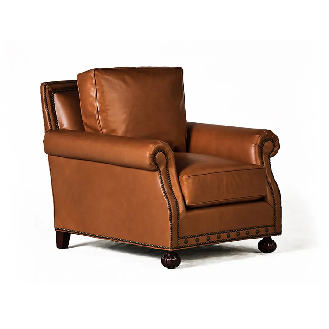 Casual elegance defines the Aran Isles collection, which unites solid wood with supple aniline leather. The chair is classically styled with rolled arms, brass nailhead trim, and front-facing bun feet. Premium spring-down cushions provide the perfect balance of softness and structure to the deep, comfortable seat.