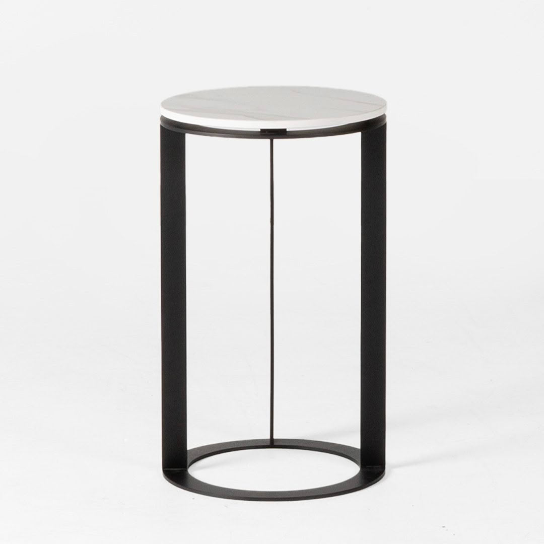 ENZO DRINKS TABLE available in blue gun steel and matt black steel with Neolith porcelain top.