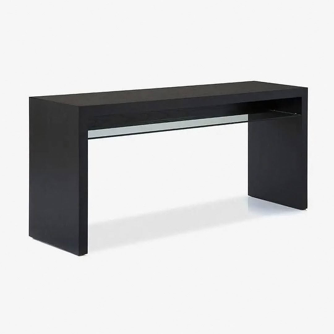 Modern black square coffee table with lower shelfElegant patio with furniture and Mediterranean architecture