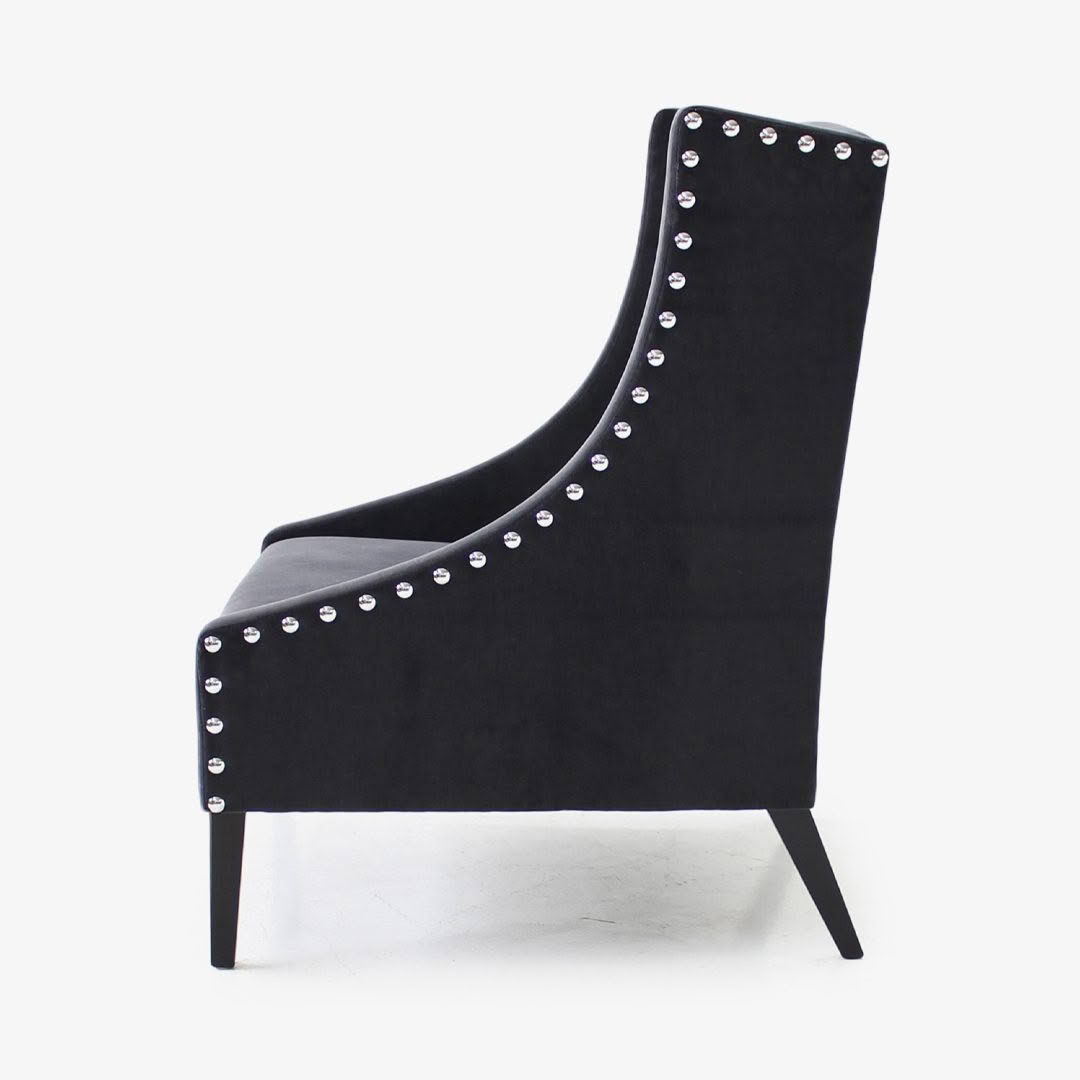 Modern black bedside table with silver legsModern black nightstand with two drawers beside bed