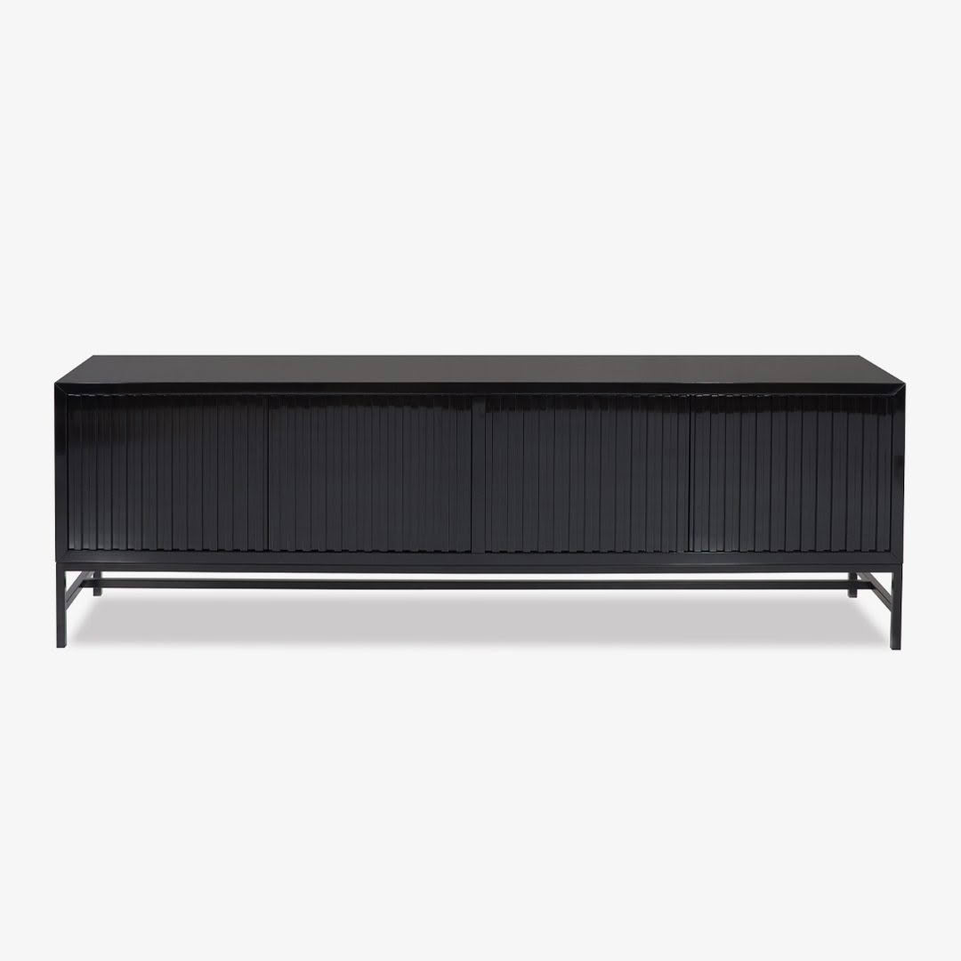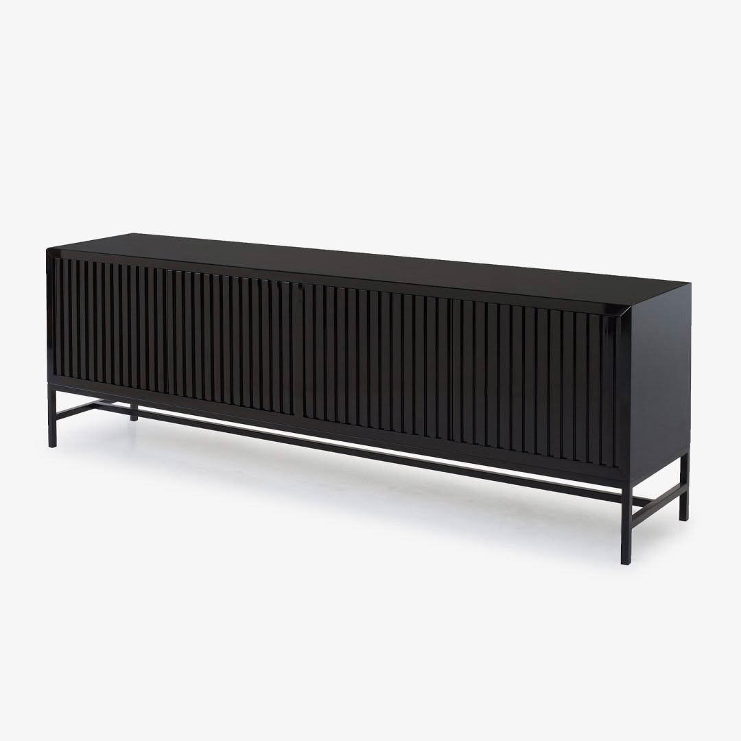 Black modern desk with textured drawers on white backgroundBlack modern console table with metal legs isolated