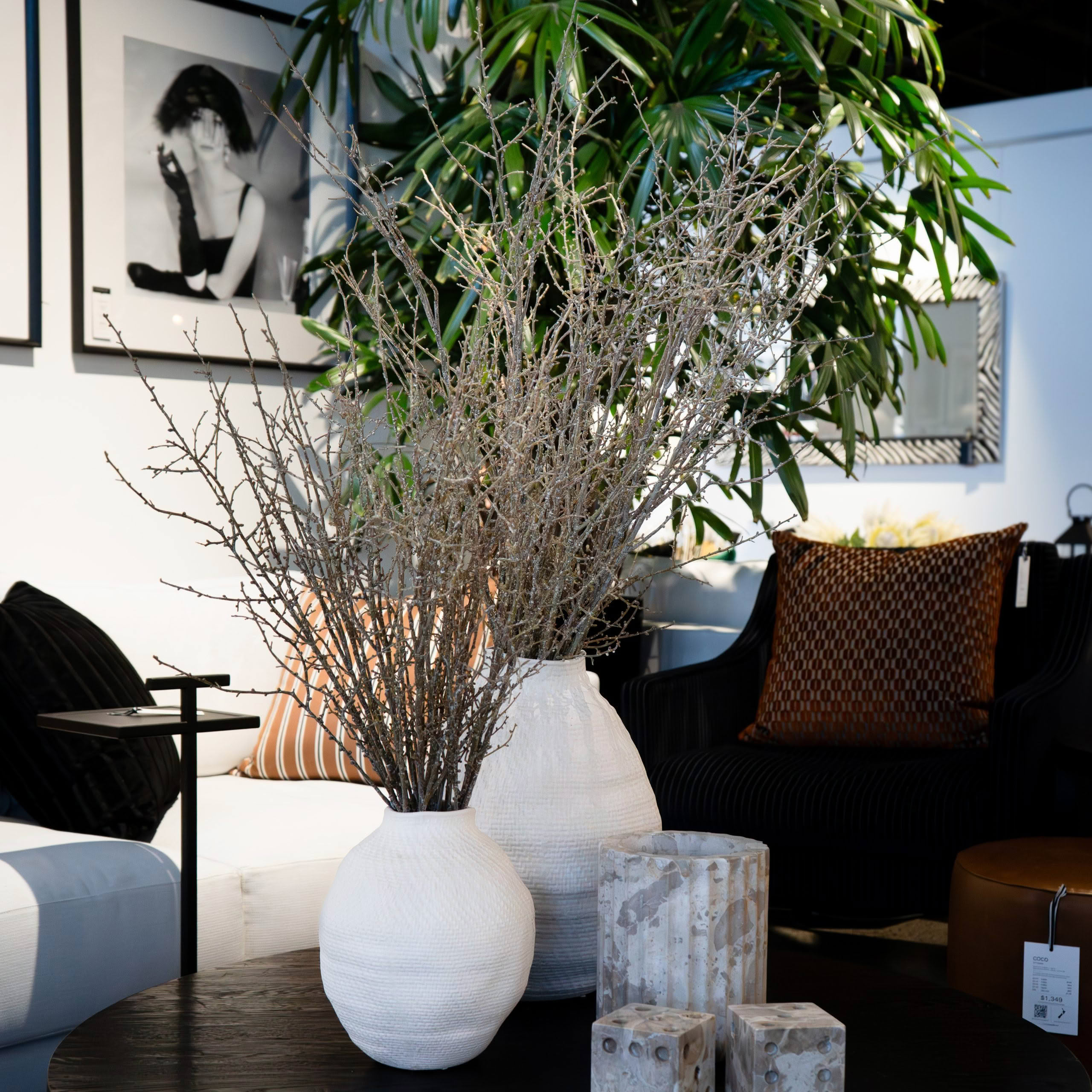 Stylish living room interior displaying design service sign