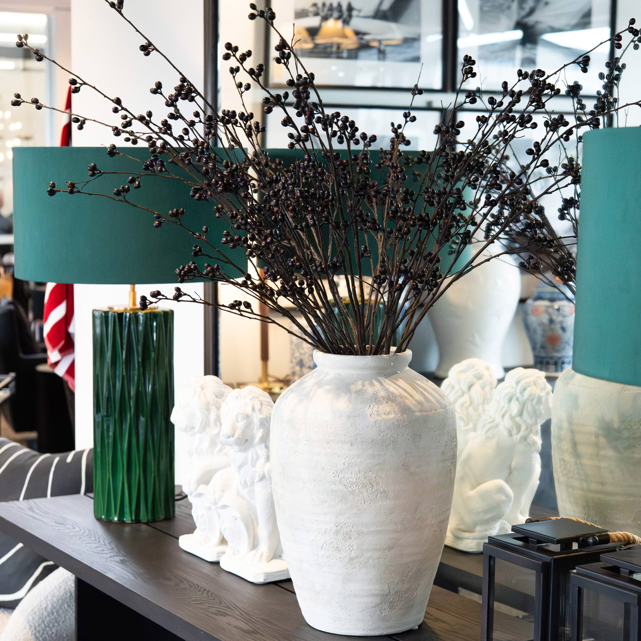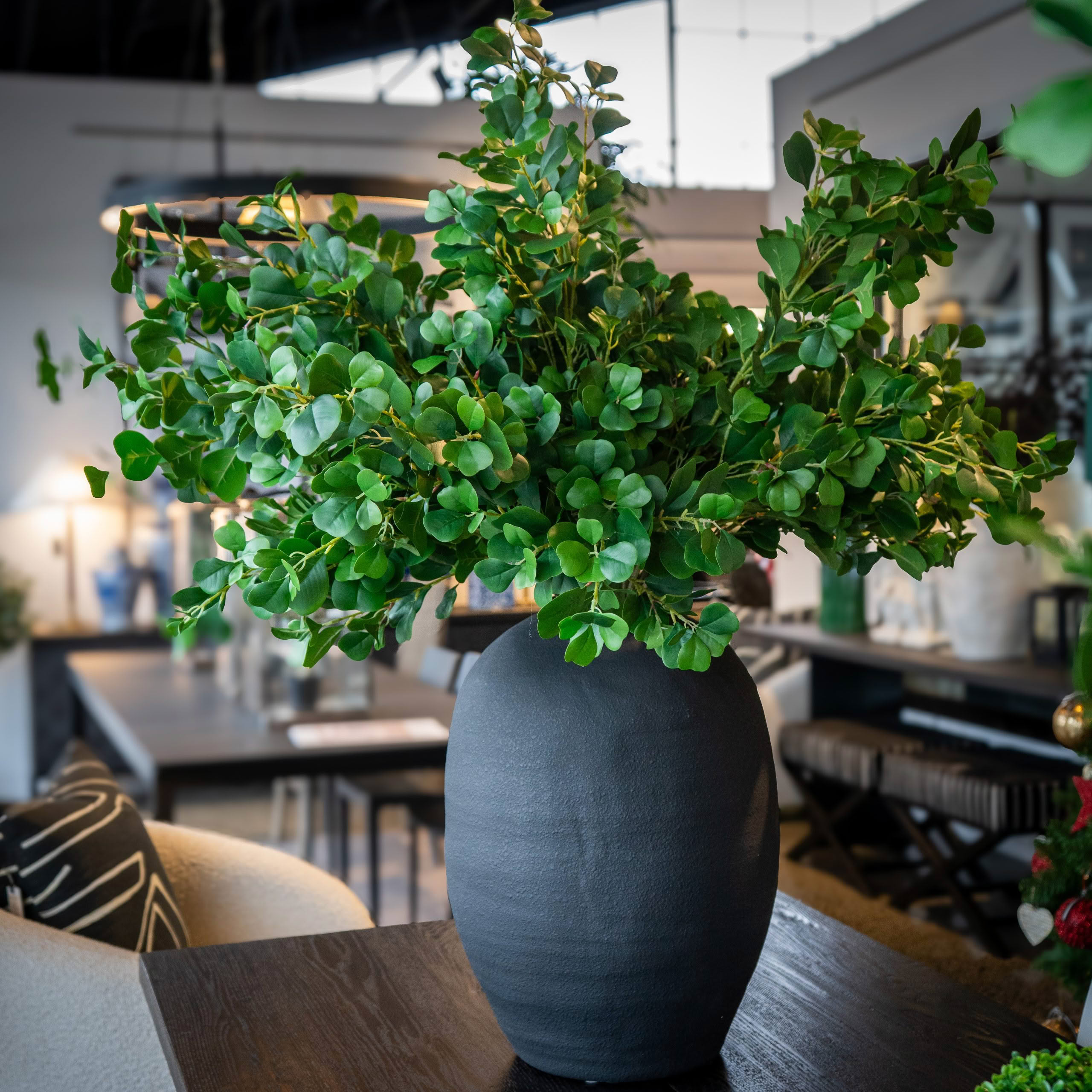 Eucalyptus in decorative white pineapple vase on wooden standWhite ceramic vase with bulbous design holding green leaves
