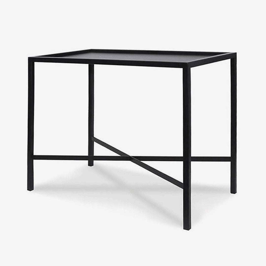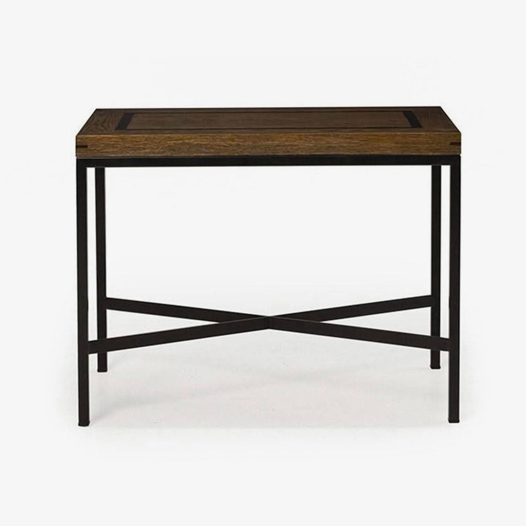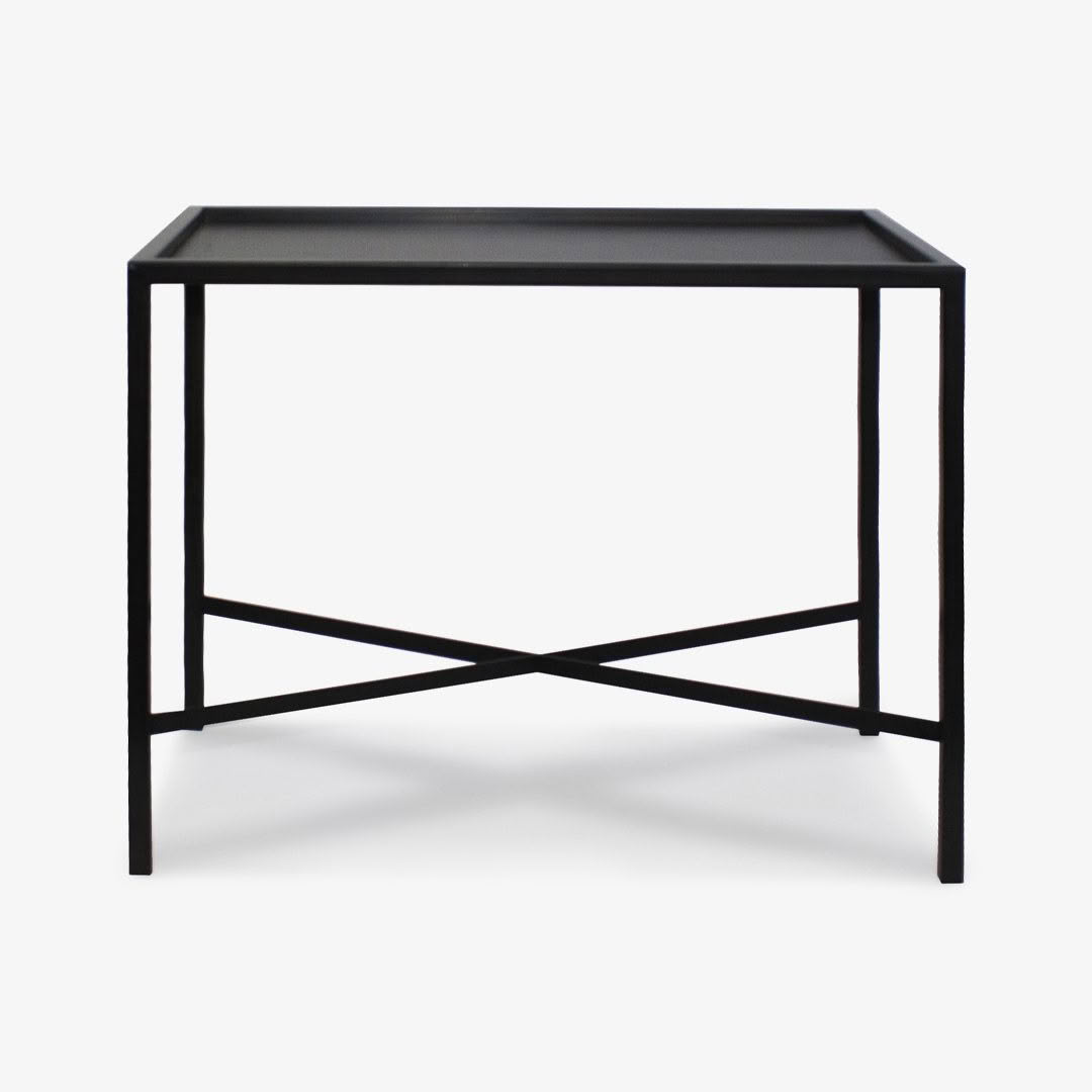 Glass coffee table on ornate orange carpet with teapot setMinimalist office with abstract blue painting and wooden chair