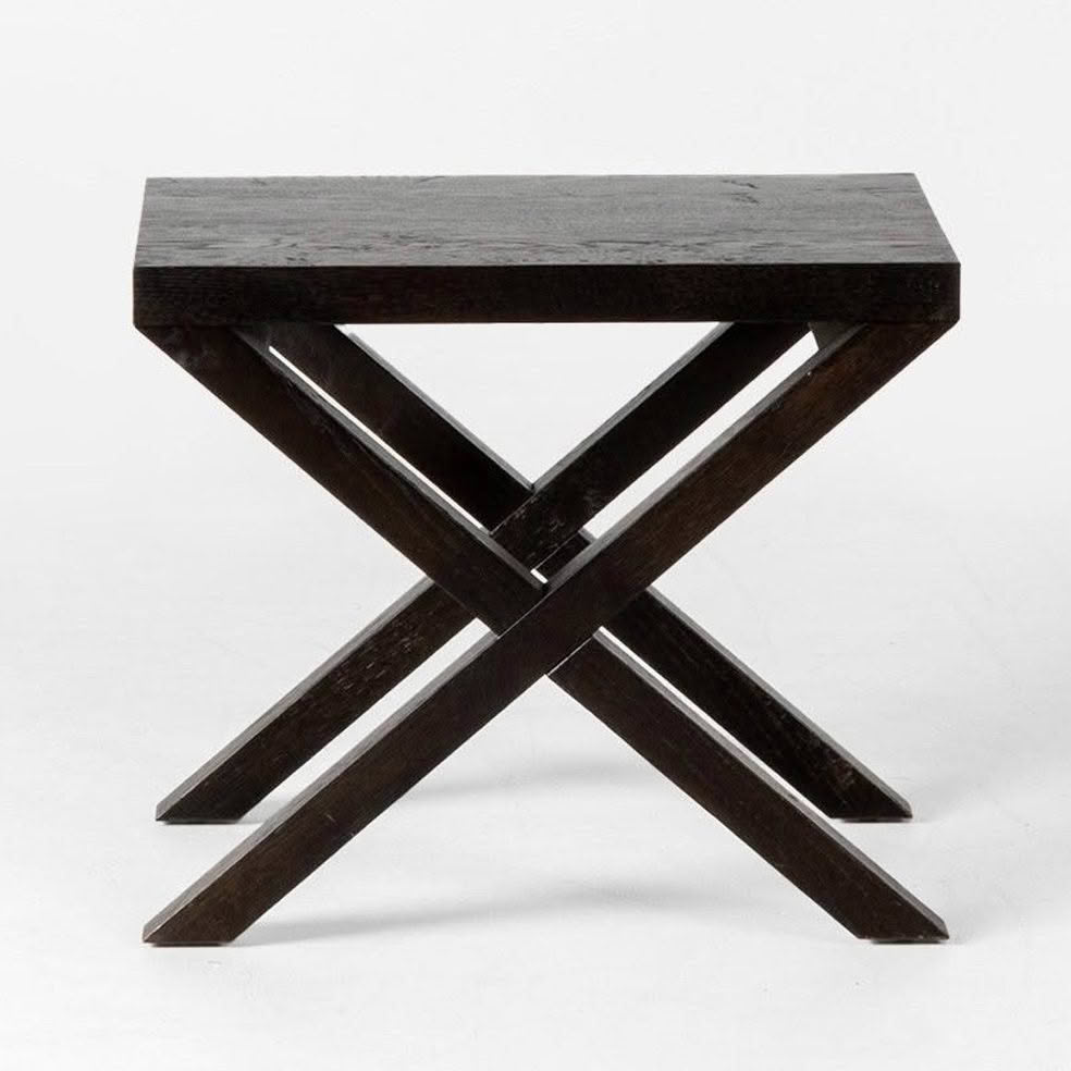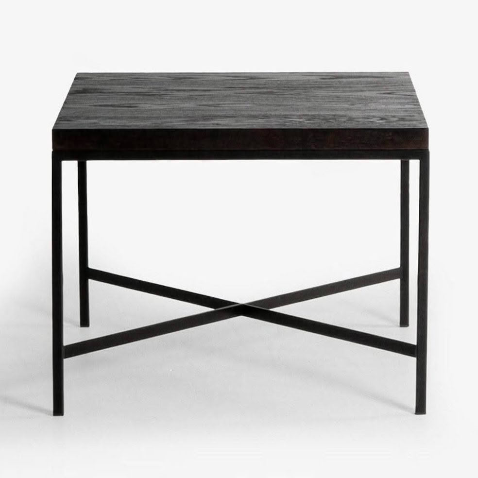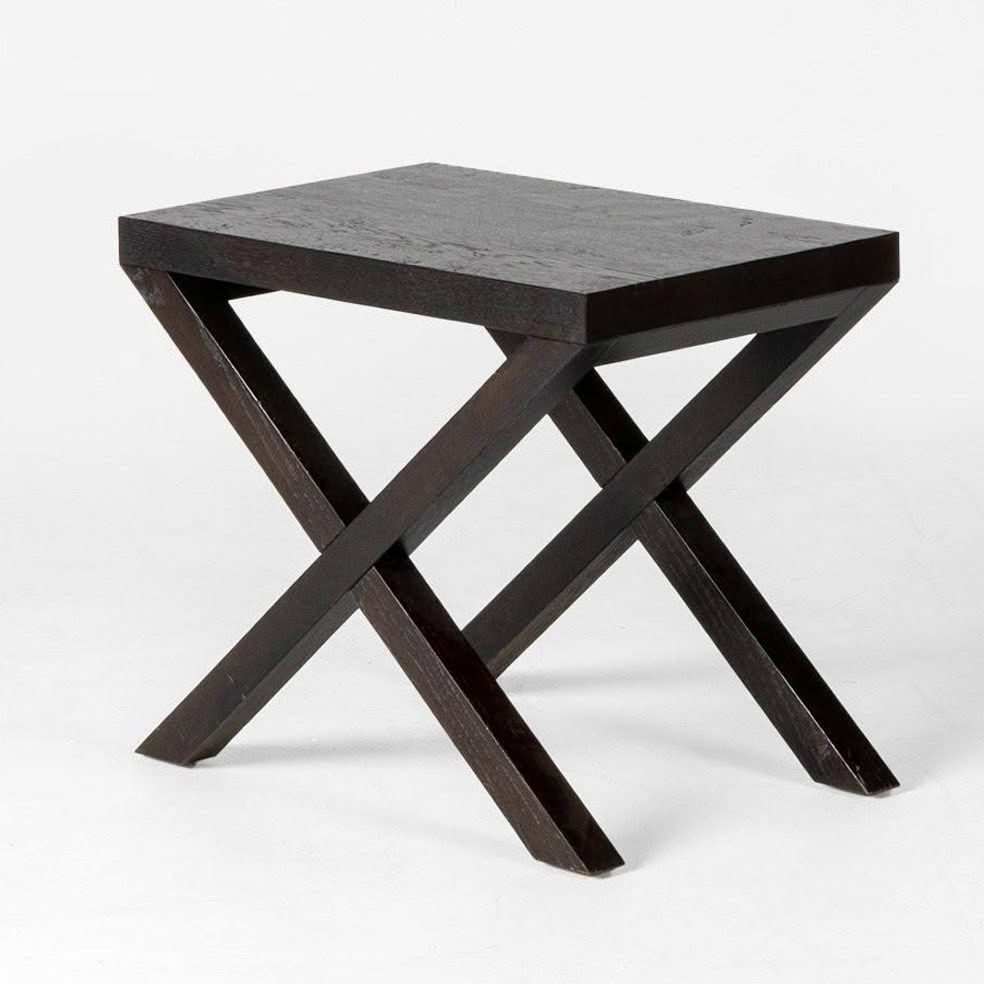 Glass coffee table on ornate orange carpet with teapot setMinimalist office with abstract blue painting and wooden chair