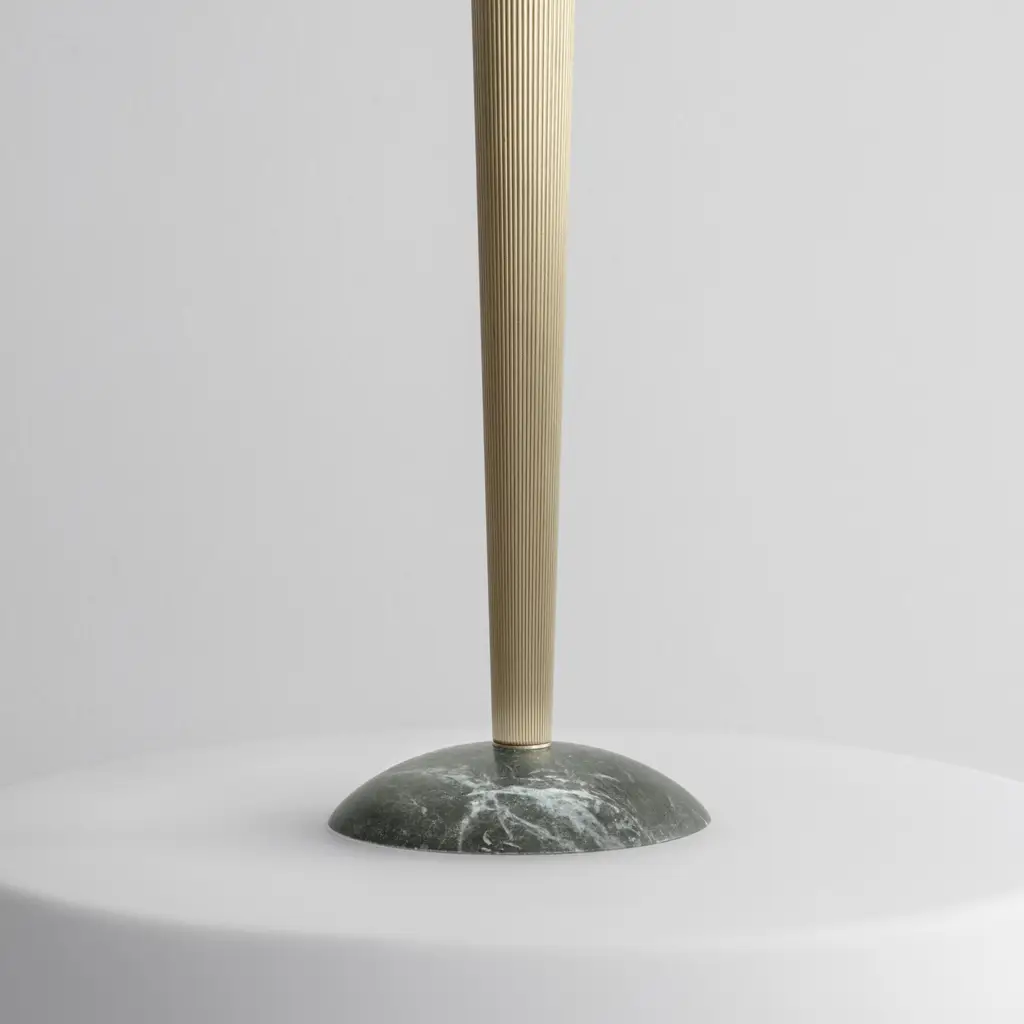 Suspended from a reeded fluted brass stem, the shade of the Trave Pendant Lamp features a two tier soft finish opal glass. The addition of marble highlights produce a light that is soft and ambient for a warm but dramatic atmosphere.