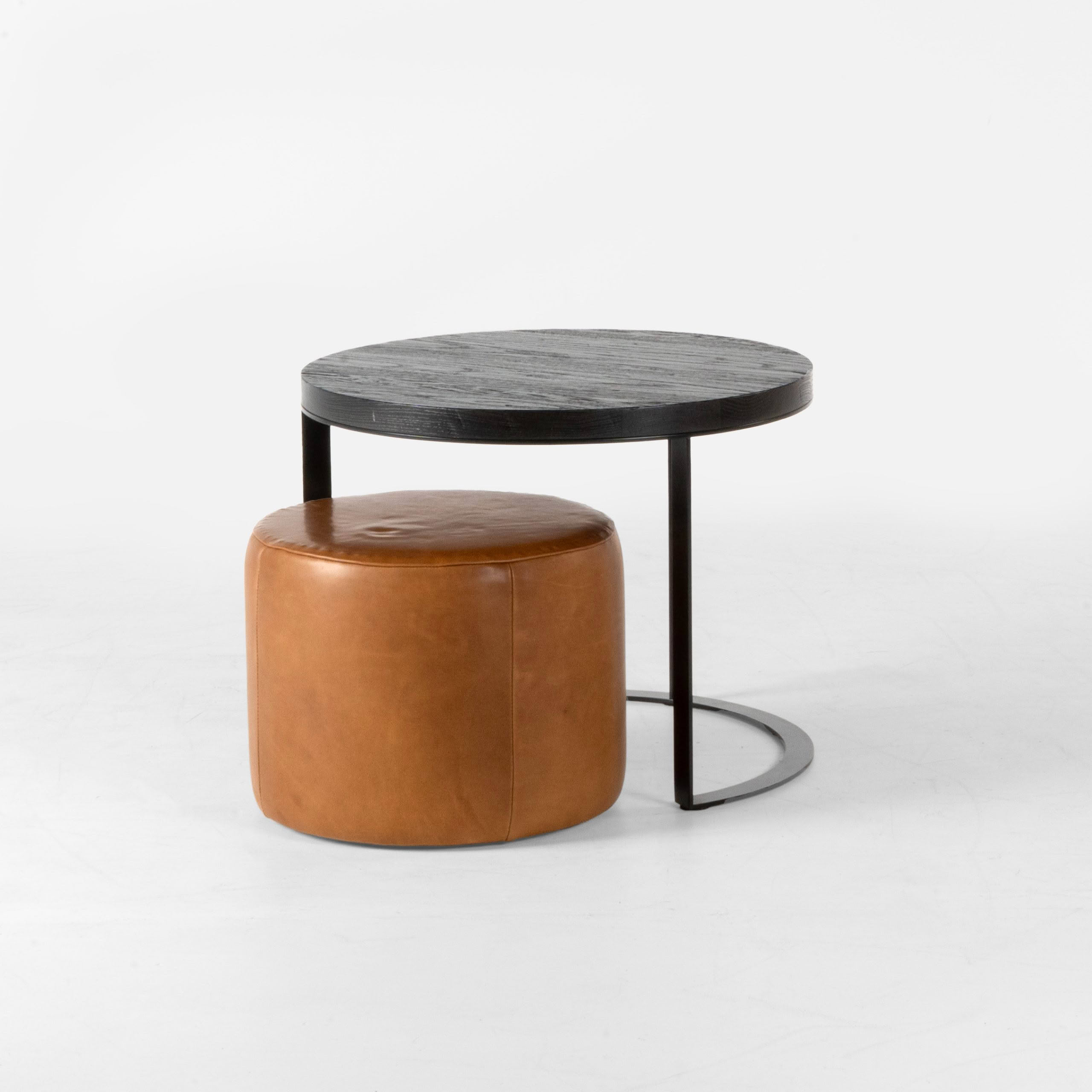 Round beige ottoman with black metal baseTan leather round stool with black metal frame
