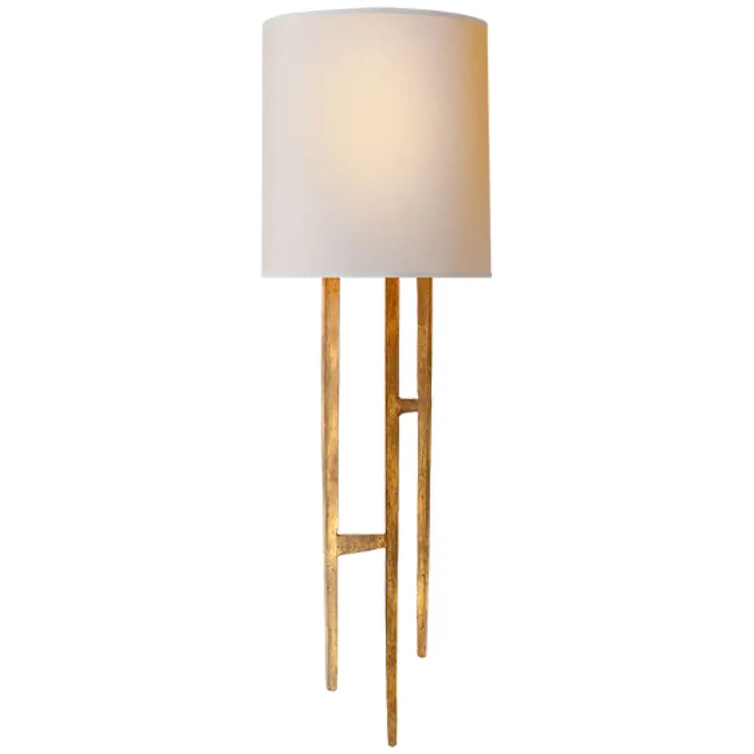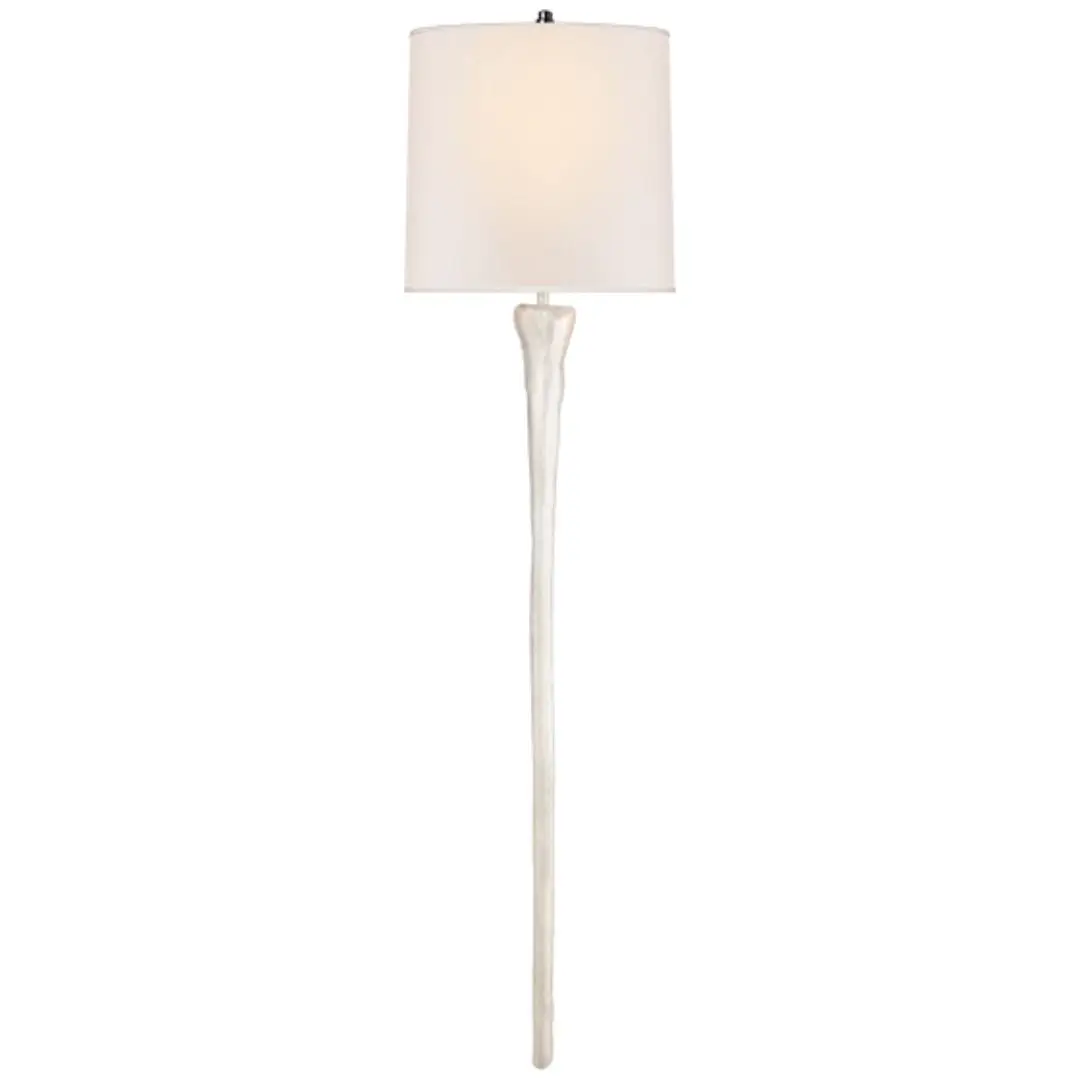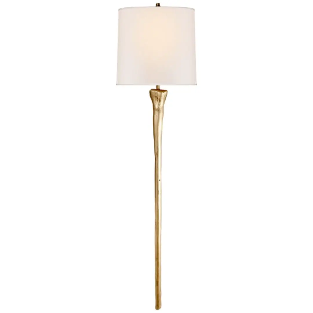Modern tripod floor lamp with beige lampshadeElegant living room with green coffee table and art