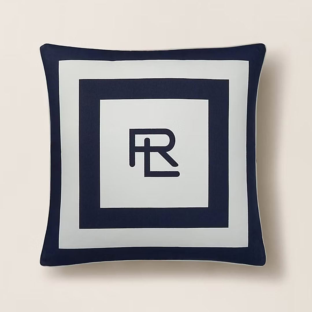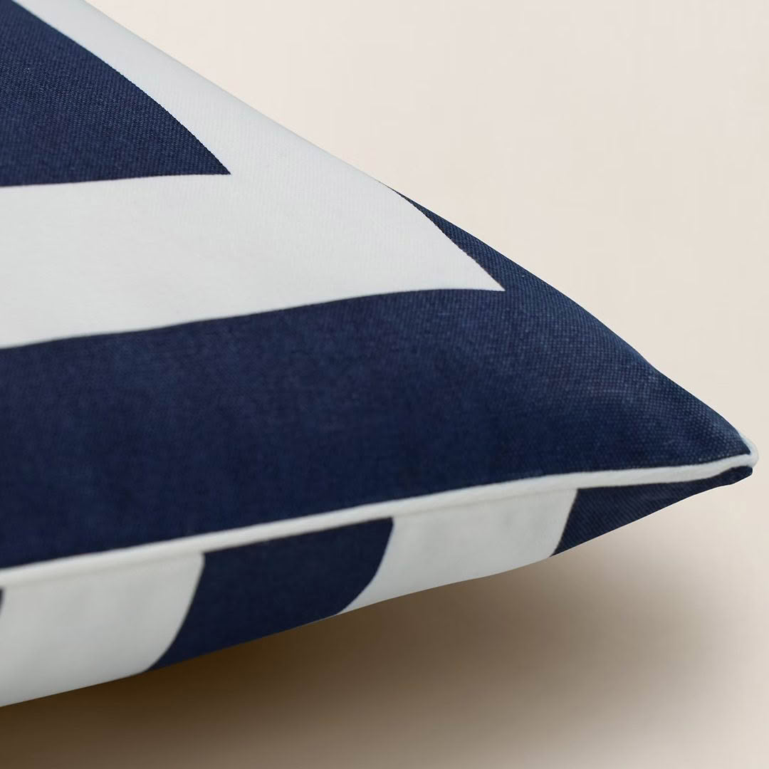 Blue decorative throw pillow with gold geometric patternTextured blue fabric with golden curved line design