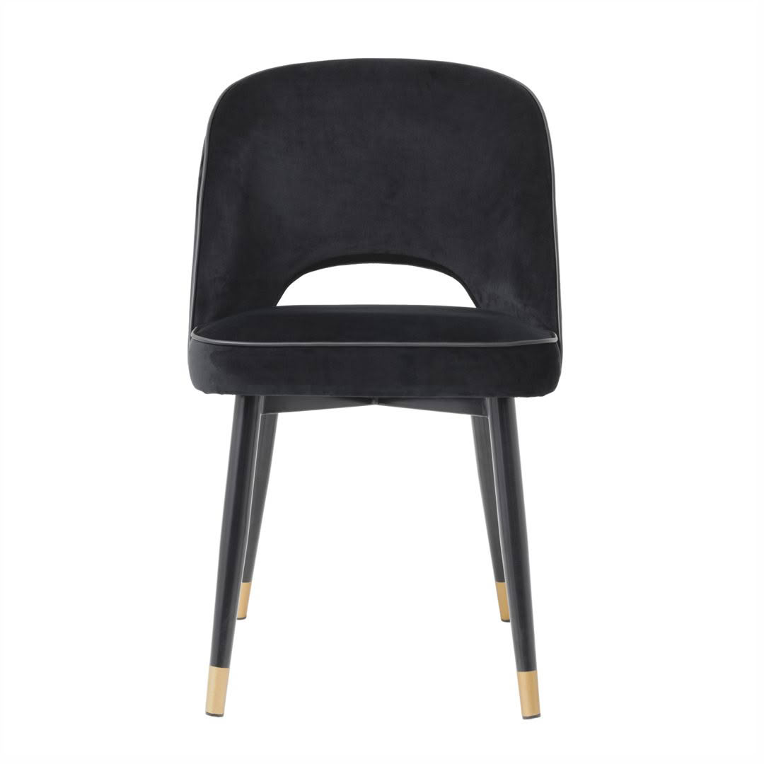 Create a wow-worthy dining room with the Cliff Dining Chair in Roche black velvet. Featuring black tapered legs with gold caps, the solid frame holds an armless back that is open at the bottom before the seat. Its stylish silhouette is accentuated with black faux leather piping.