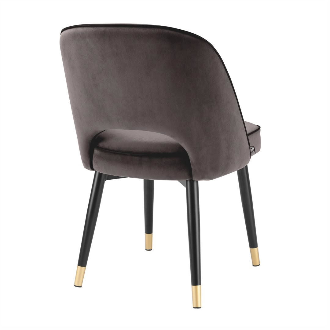 Create a wow-worthy dining room with the Cliff Dining Chair in Savona grey velvet. Featuring black tapered legs with gold caps, the solid frame holds an armless back that is open at the bottom before the seat. Its stylish silhouette is accentuated with black faux leather piping.