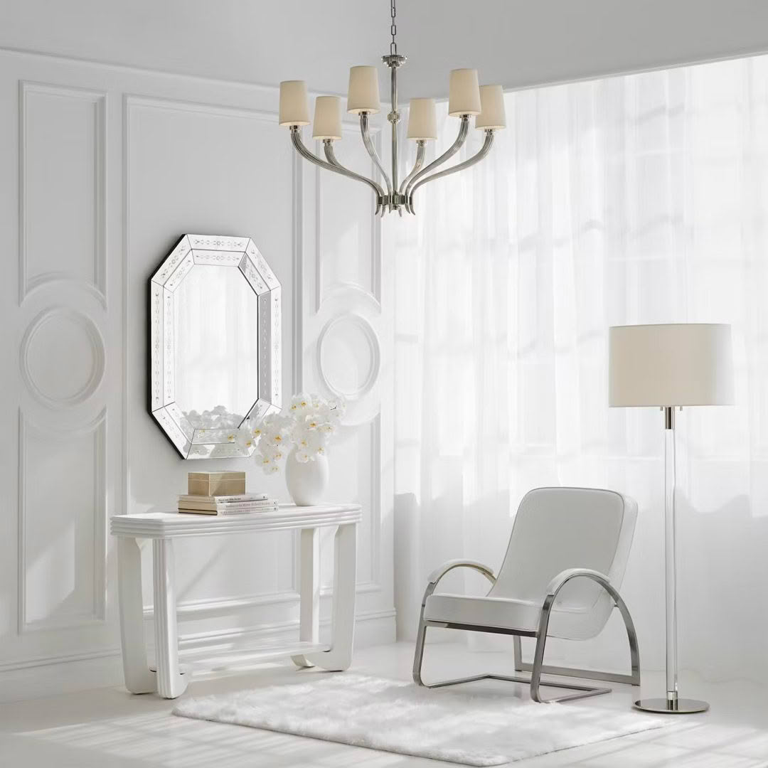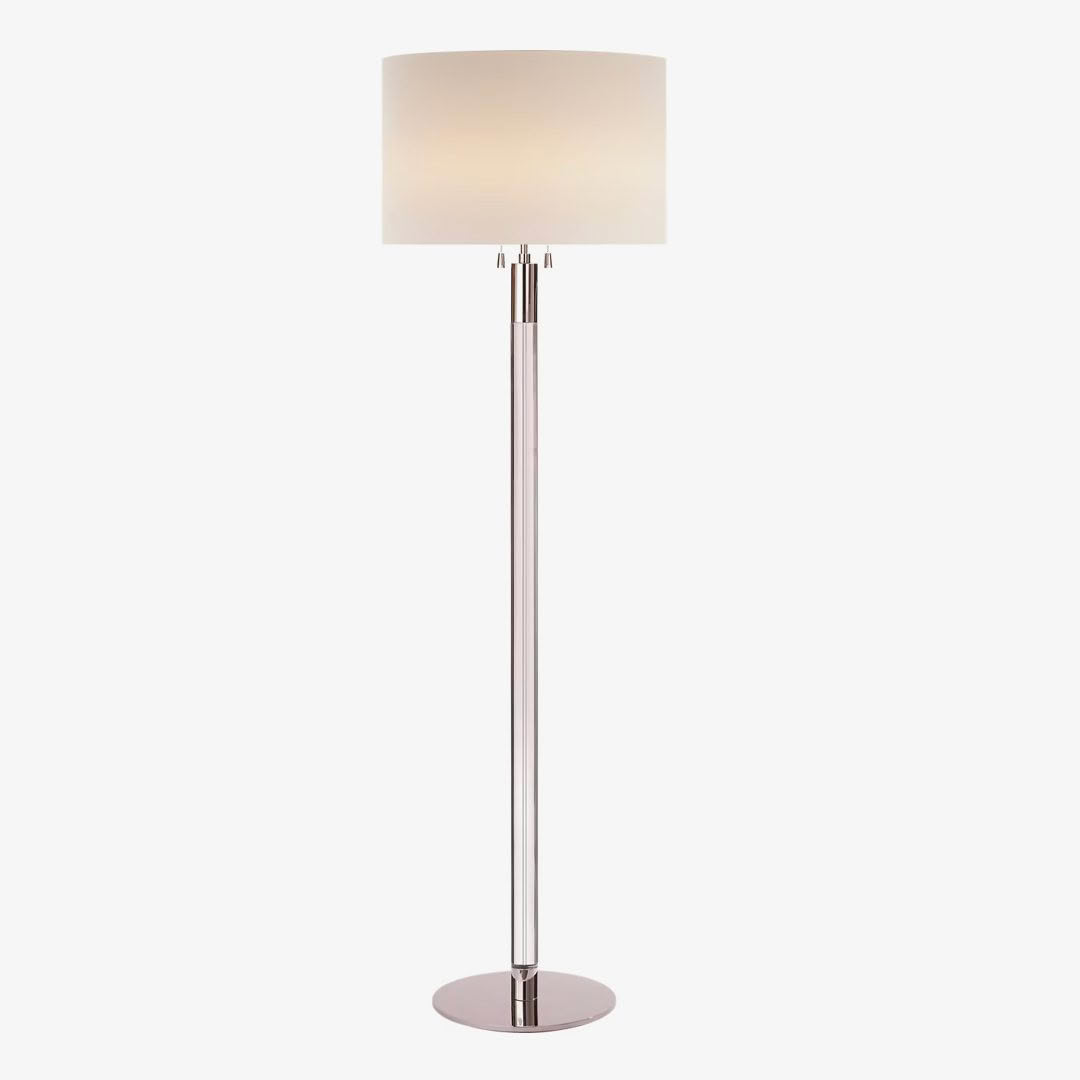 Tall modern chrome floor lamp with white shade