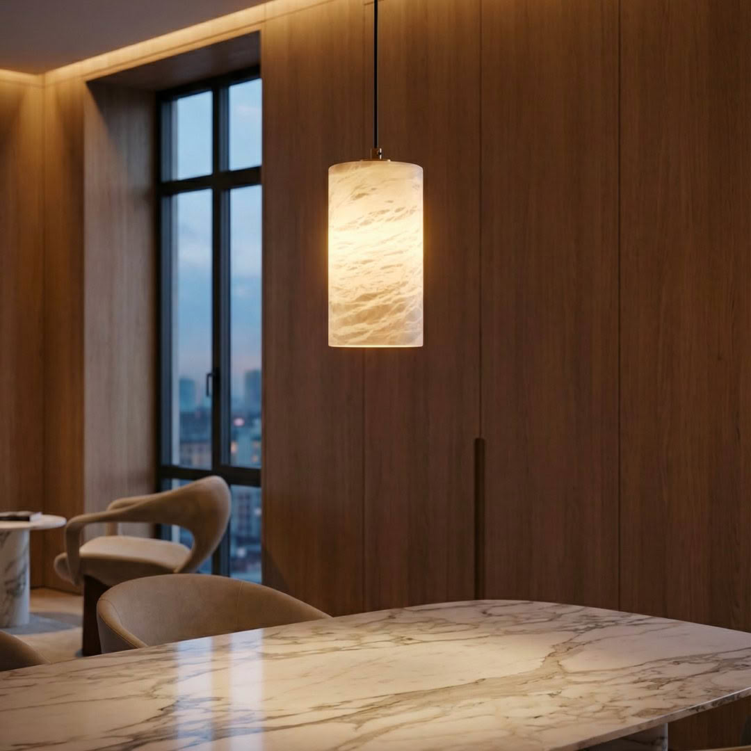 Elegant alabaster table lamp with square linen shadeElegant marble table lamp beside a beige sofa