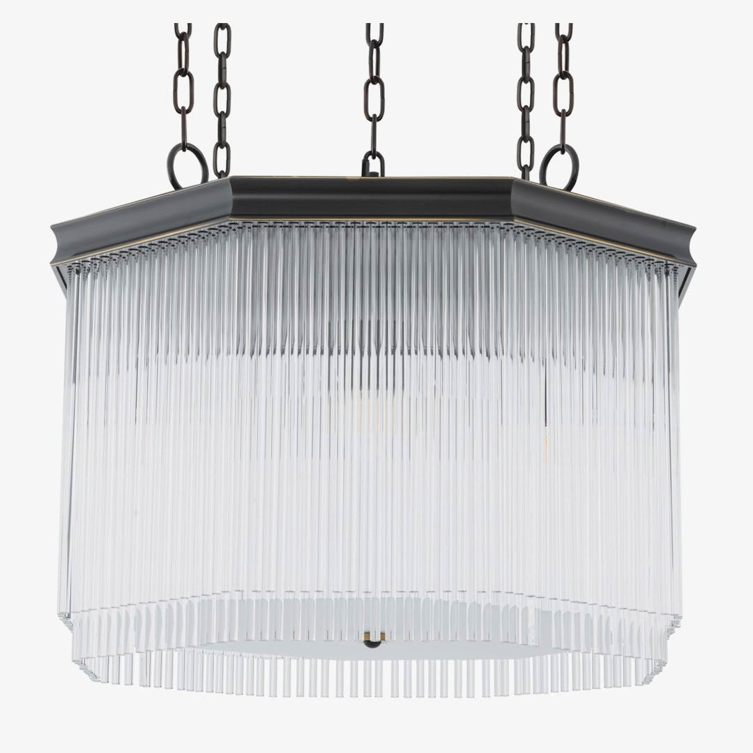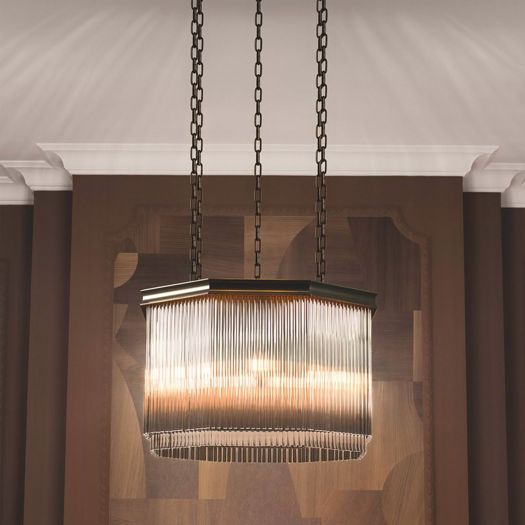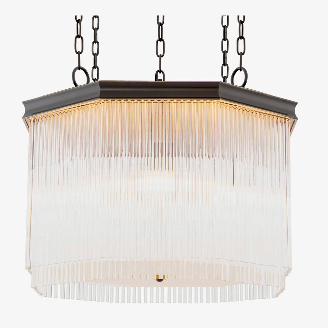 The Estela is a sophisticated fusion of Art Deco heritage and contemporary refinement. Its dark bronze octagonal frame, suspended by dual chains, evokes the geometric rigor and symmetry that defined 1930s design, an era when architecture and interior decor celebrated both glamour and precision. Hundreds of slender glass rods cascade in rhythmic tiers, recalling the linear elegance of early skyscrapers and the shimmer of flapper-era fringe gowns.