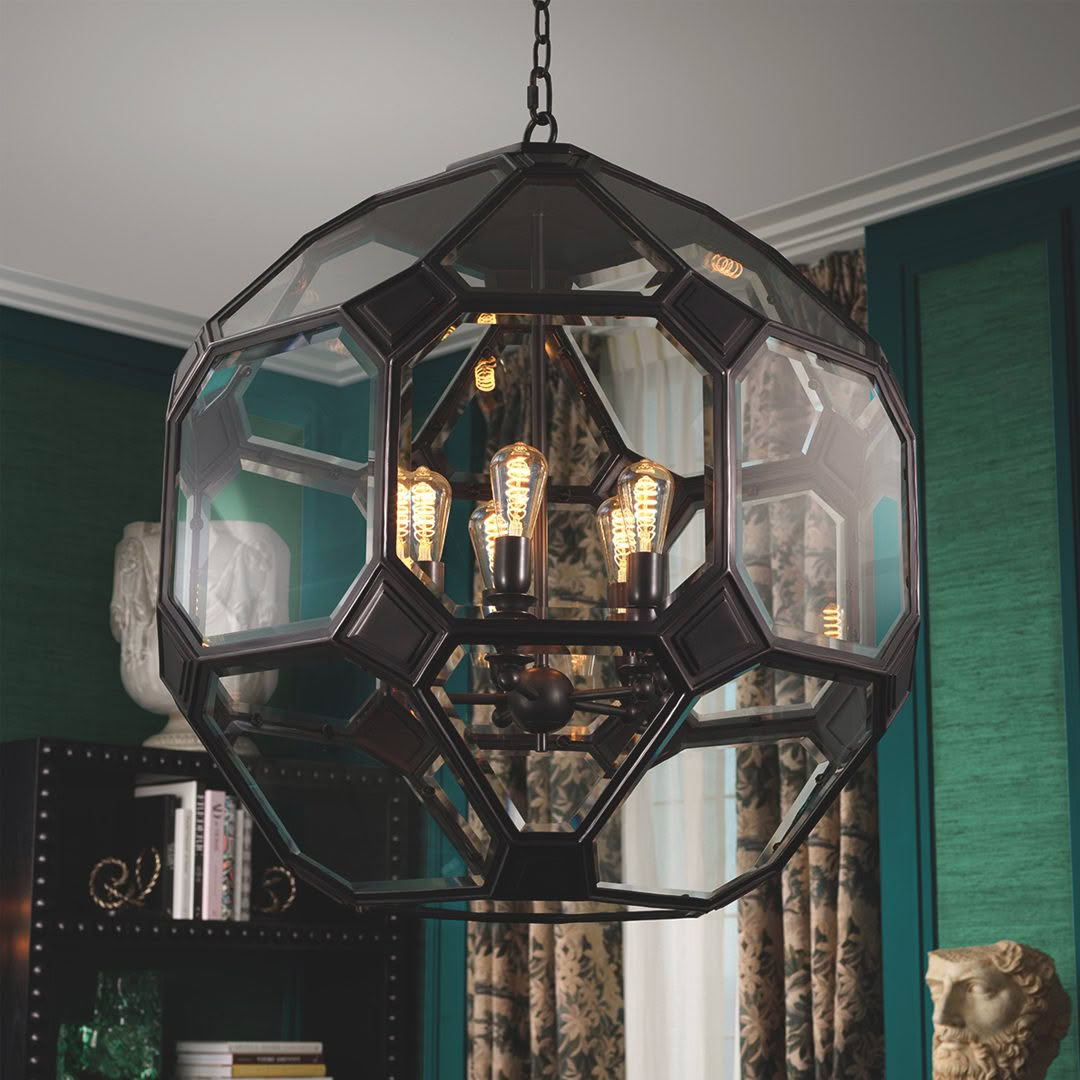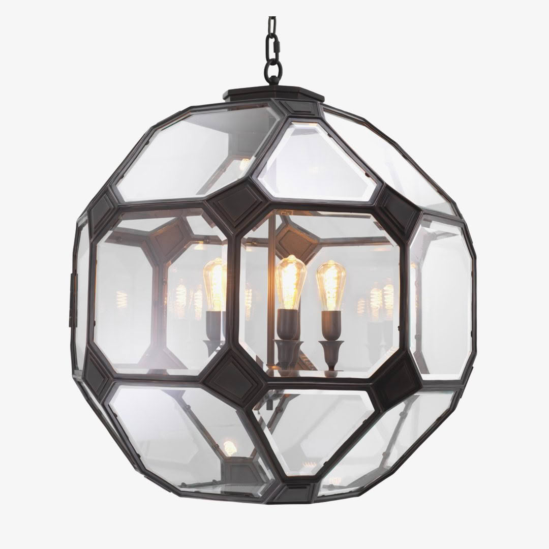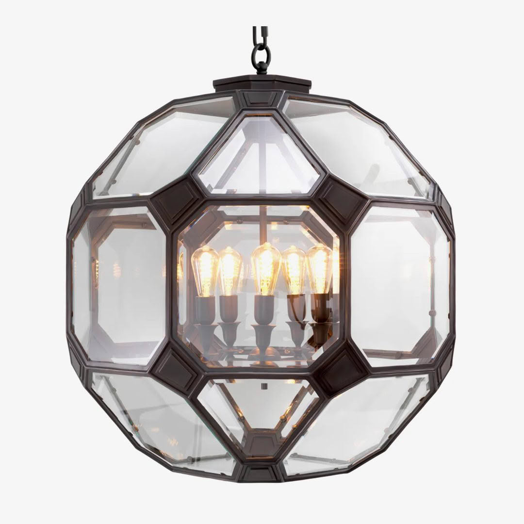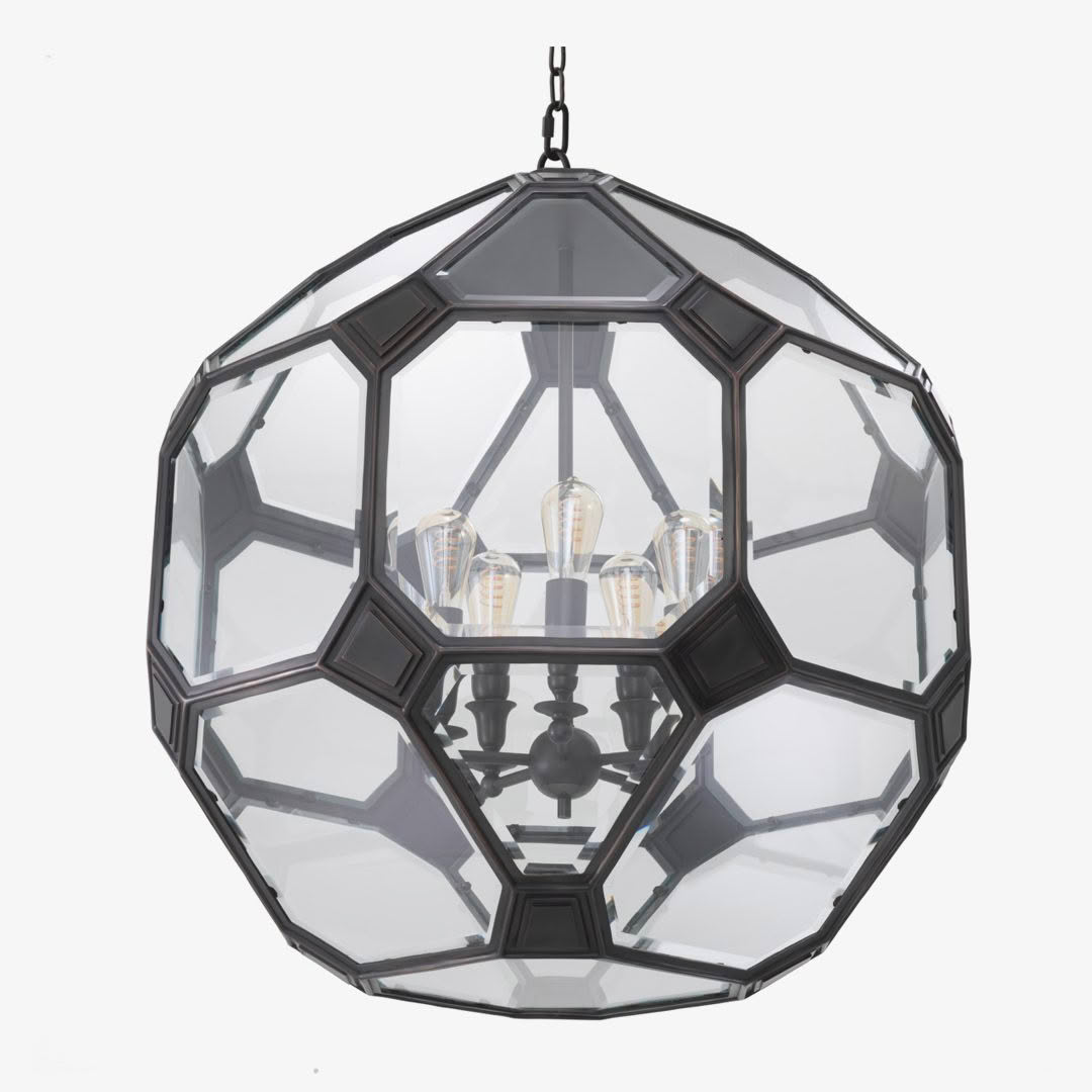 The Olympia chandelier is a sculptural meditation on form, balance, and illumination, an object that bridges art and science. Its faceted, geometric structure evokes the crystalline symmetry of a molecular lattice or the orbital precision of a planetary model. Framed in darkened metal and enclosed in beveled glass panels, the fixture captures light as if within an atom’s core, reflecting it outward in prismatic layers. Floating within its transparent shell, a constellation of exposed bulbs radiates with quiet intensity, their warm glow emphasizing the fixture’s architectural clarity. The interplay of reflection and refraction creates a visual dialogue between solidity and weightlessness, order, and energy. Available in two sizes, Olympia offers both intimate and monumental expressions of the same concept: a luminous sphere of modern craftsmanship that transforms light into a living structure, an homage to the atomic beauty that underlies both design and the natural world.