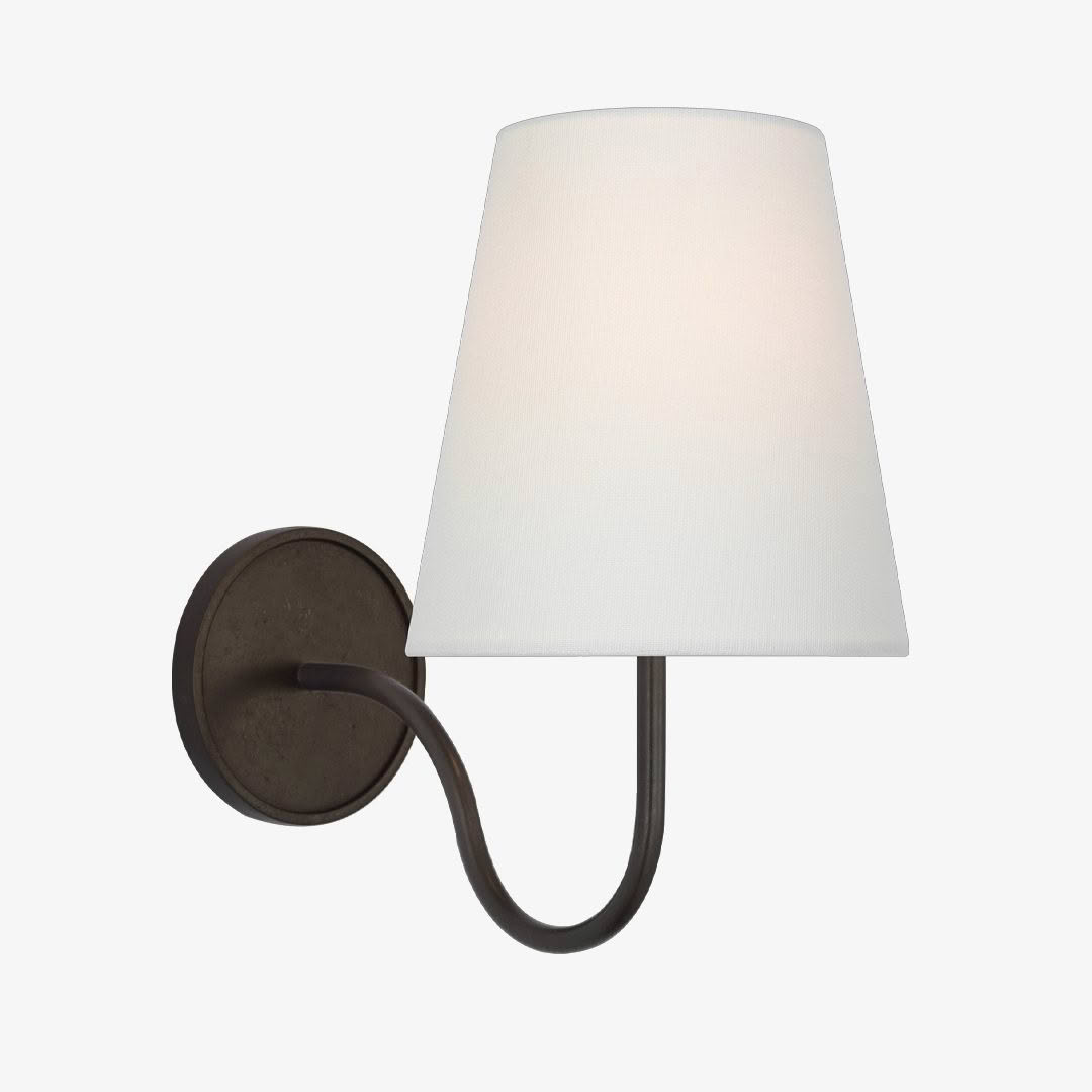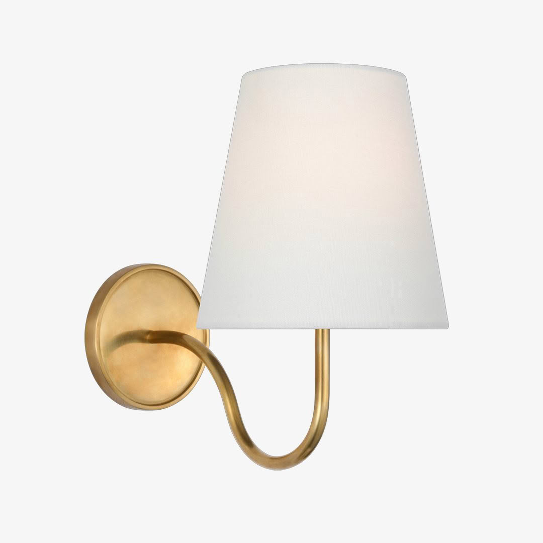 Lyndsie Small Sconce in Hand-Rubbed Antique Brass with Linen Shade.