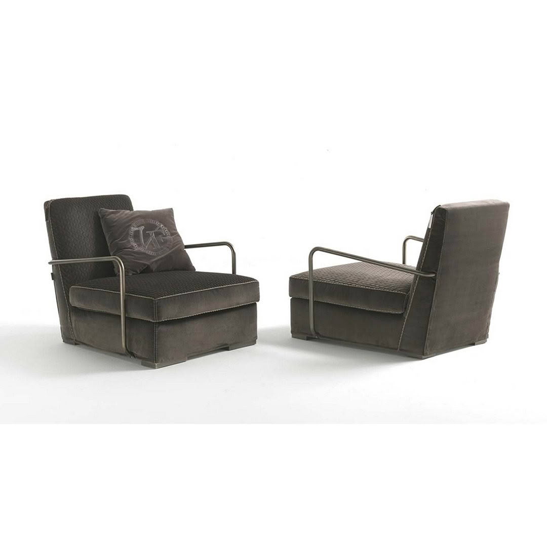 Comfortable seats and soft forms create an interesting contrast with the metal arms and the minimalist design