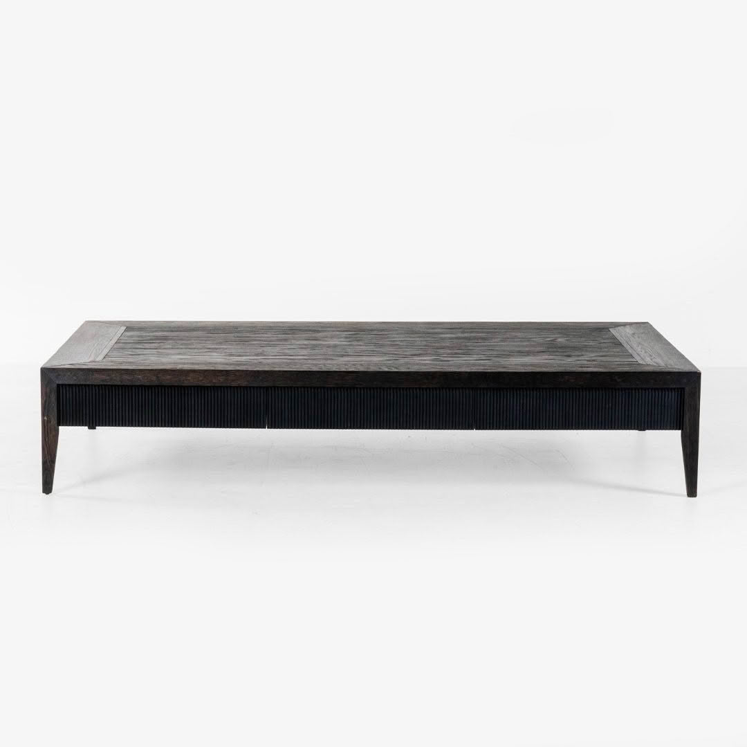 The CANAPE coffee table with drawer is made from solid oak, it features a bordered top with ebonised inlay, scalloped details under the top along with a hidden draw, made to size and finish in New Zealand.