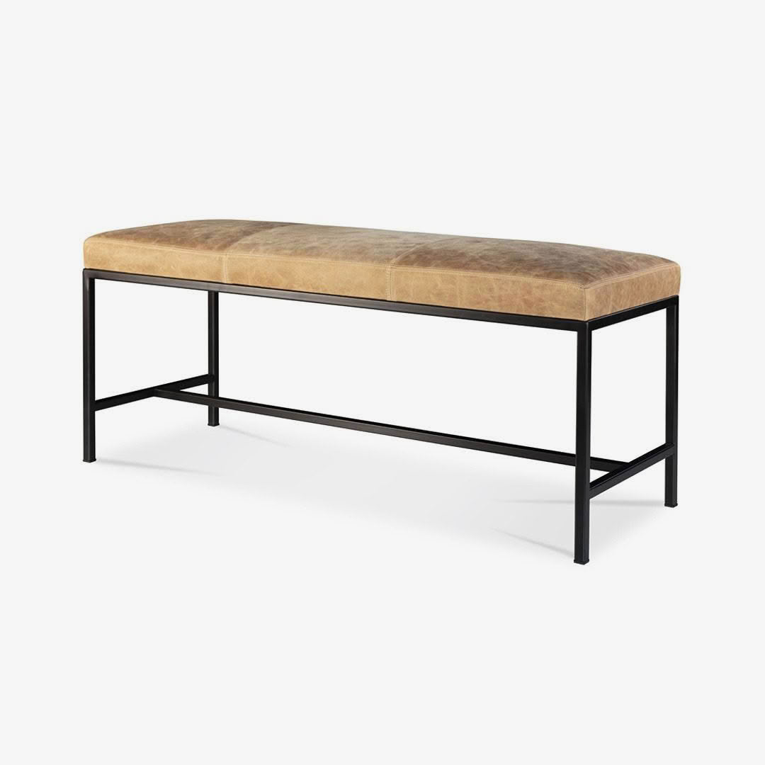 Elegant modern bench with golden legs and beige cushionModern living room with sofa and scenic window view