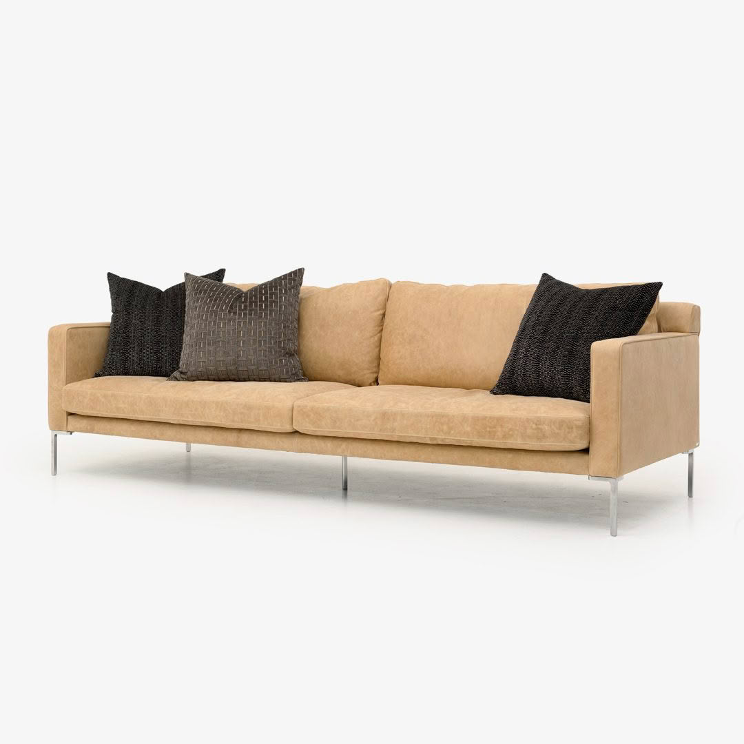 Modular beige sectional sofa with white cushionsModern curved sofas in stylish interior setting