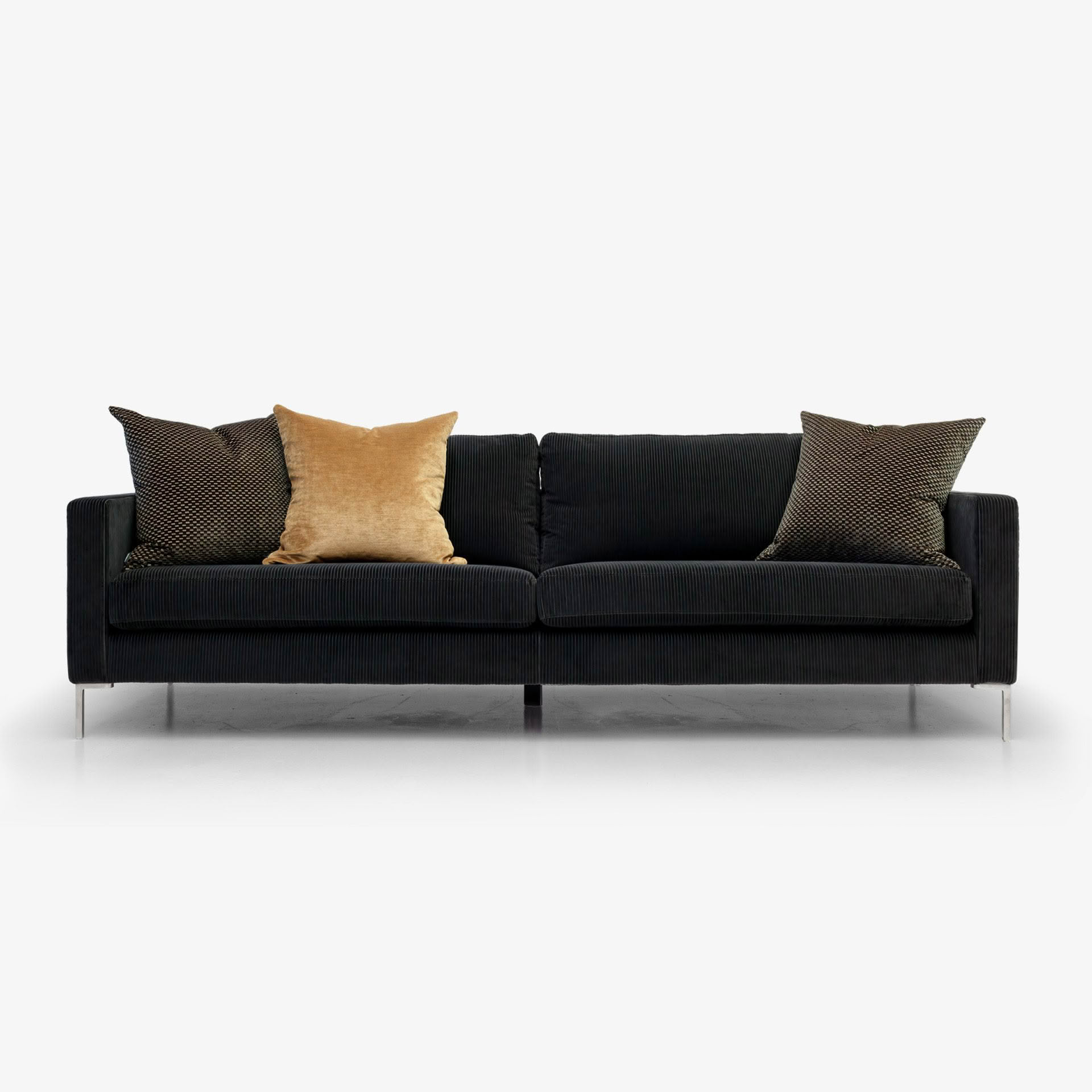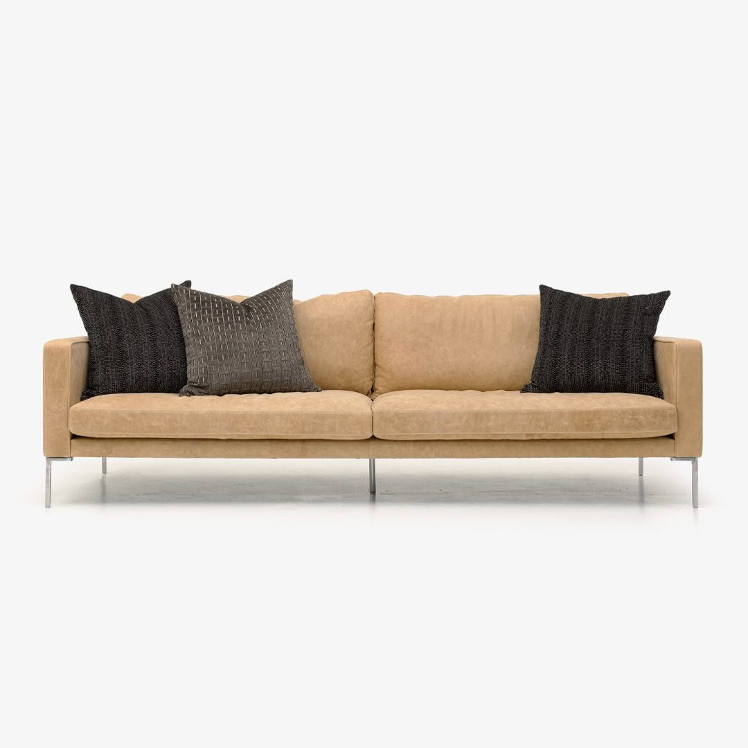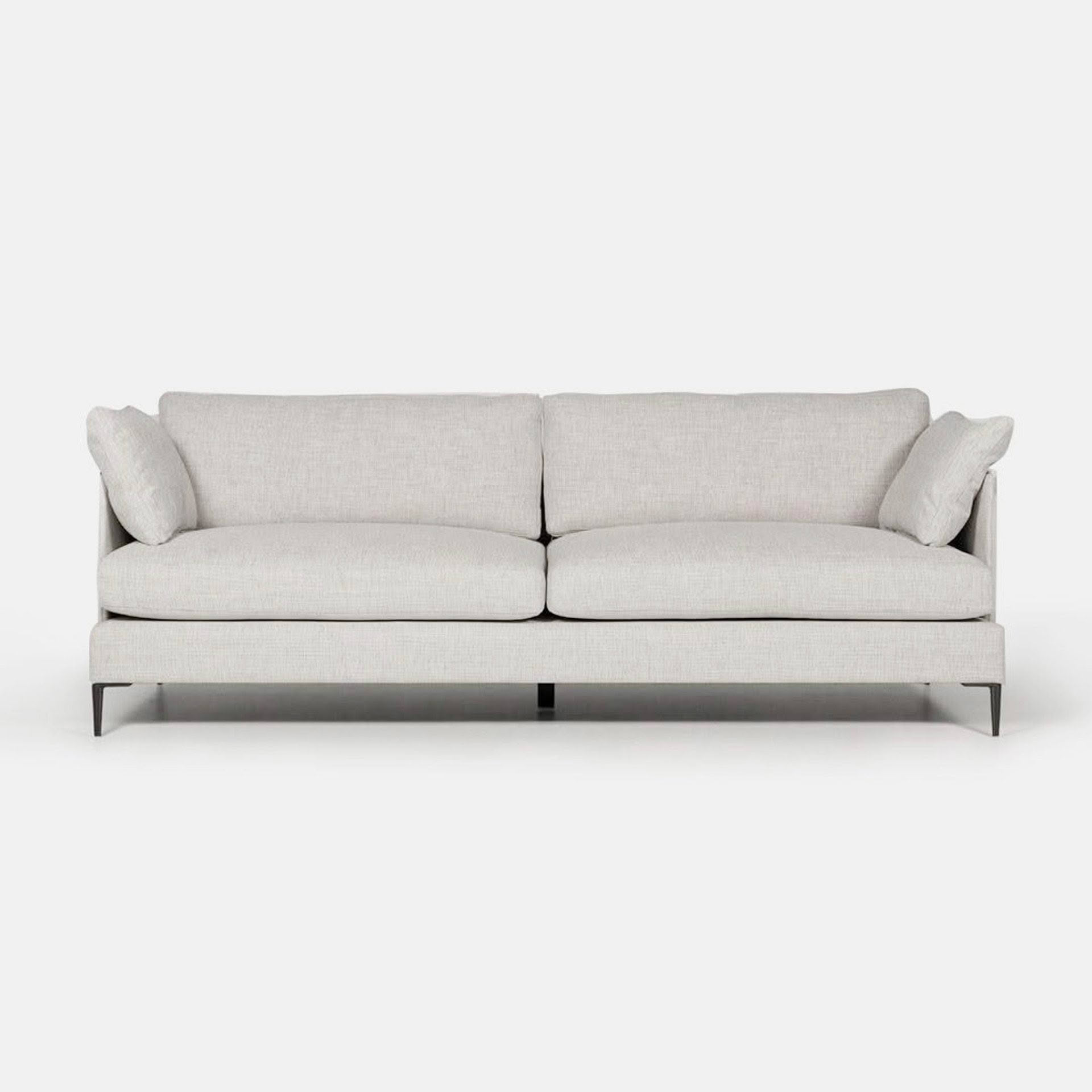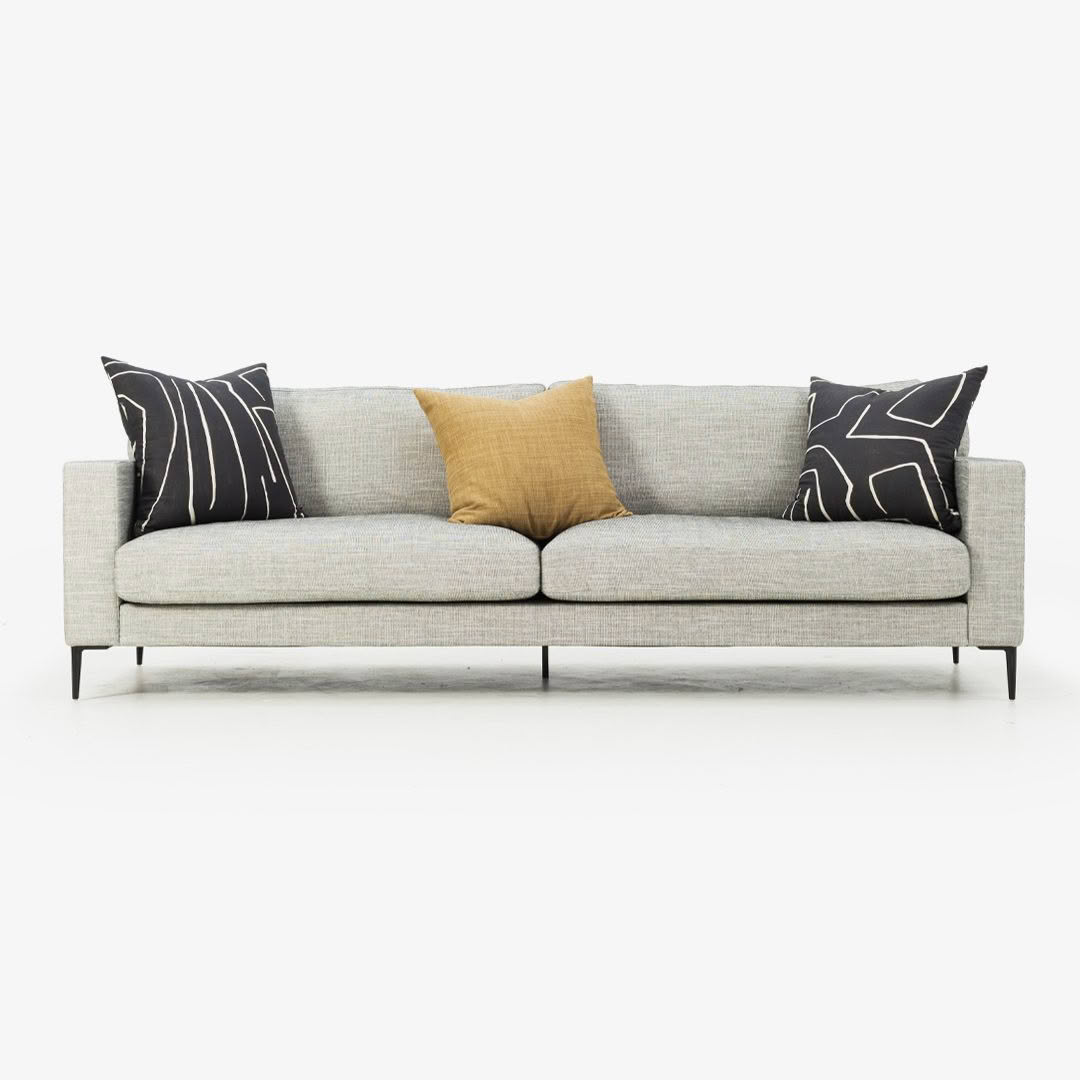 Modern beige fabric three-seater sofa on white backgroundModern gray fabric three-seater sofa
