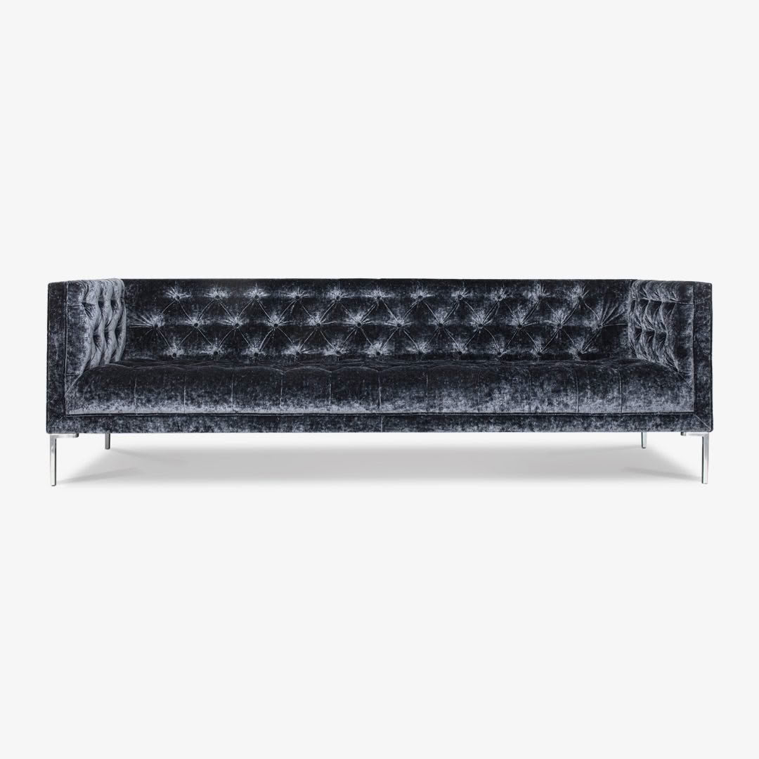 Black tufted leather bench on carved wooden legsElegant black tufted ottoman with wooden legs