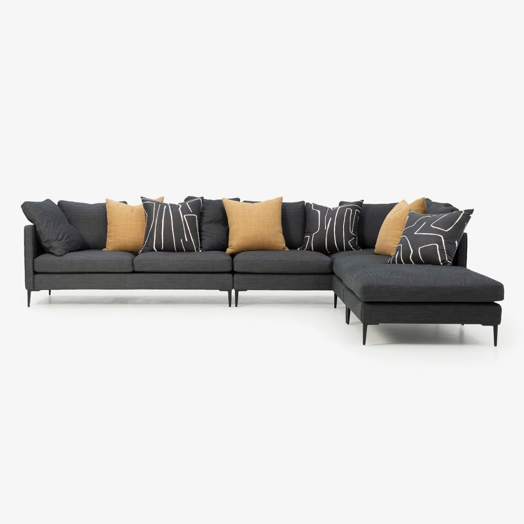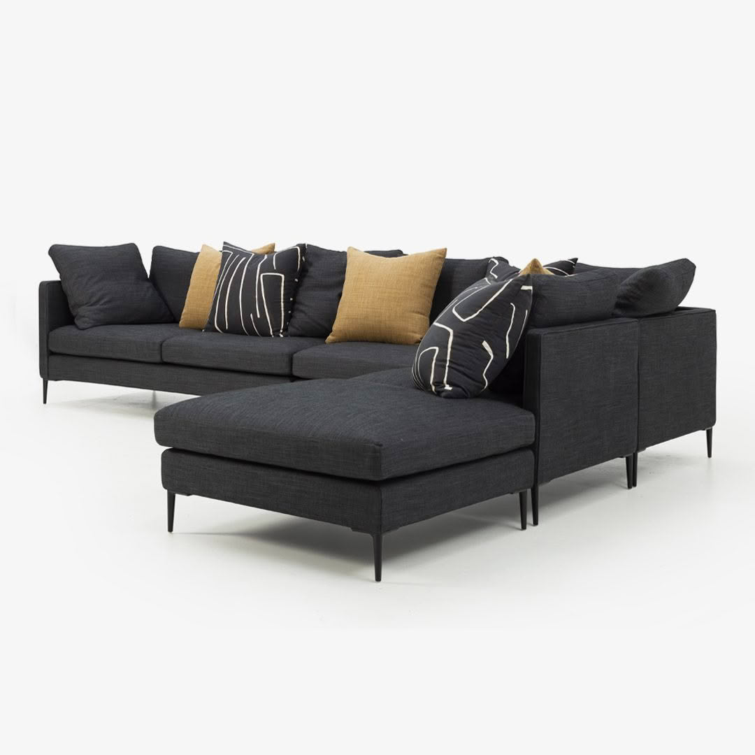 Modern beige sofa with black side tableMinimalist black metal side table