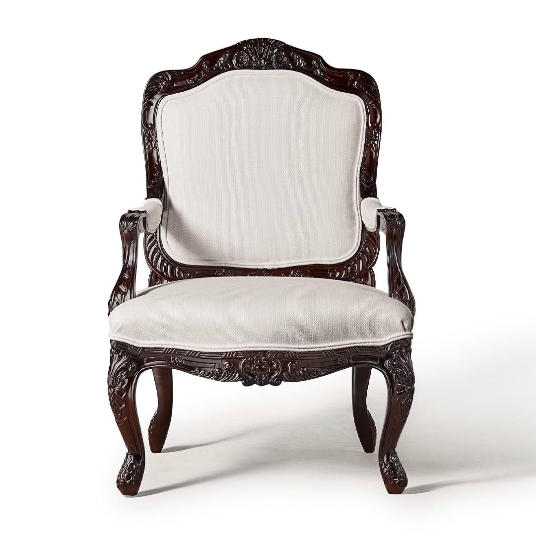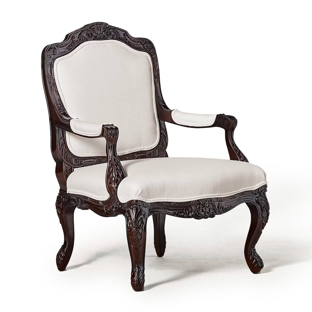 Elegant high-back beige wing chair with dark wooden legsElegant white wingback chair with dark wooden legs