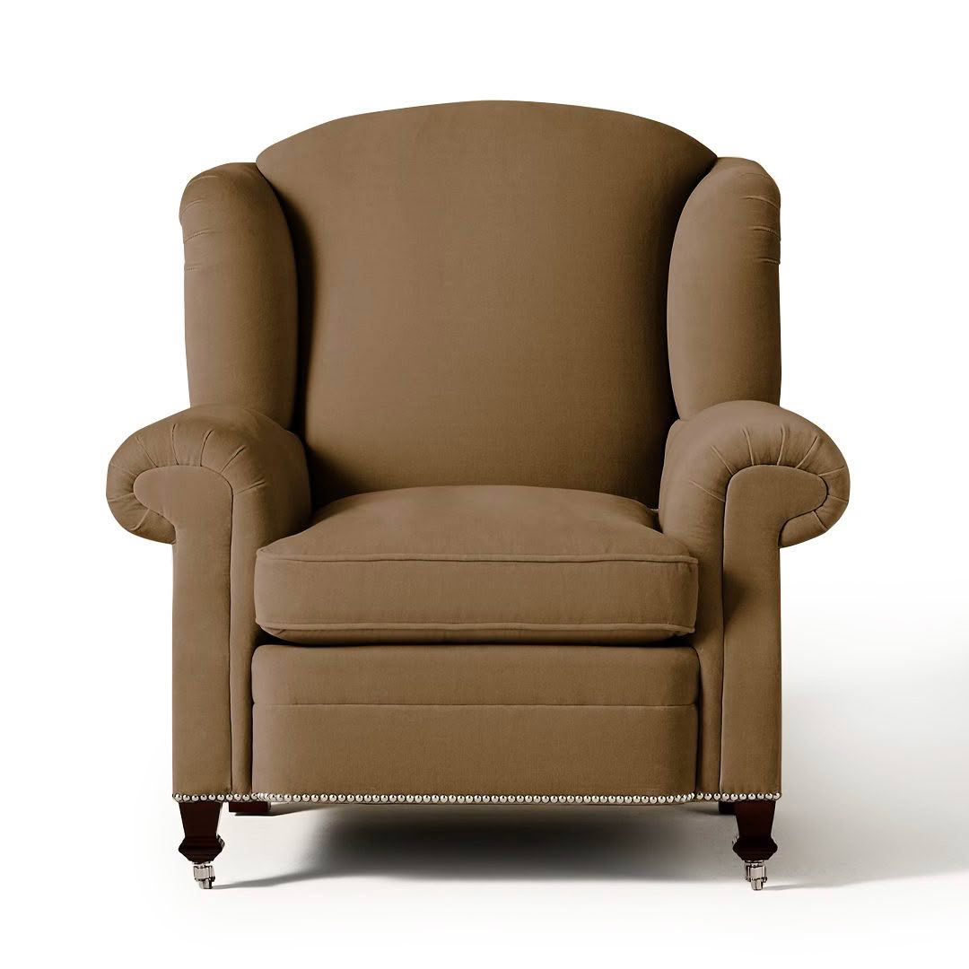 Elegant white upholstered armchair with dark wood trimDetailed carving on dark wood sofa leg.