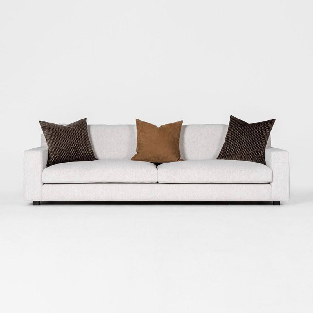 Elegant white fabric sofa with plush cushionsElegant white three-seat cushioned sofa with pillows