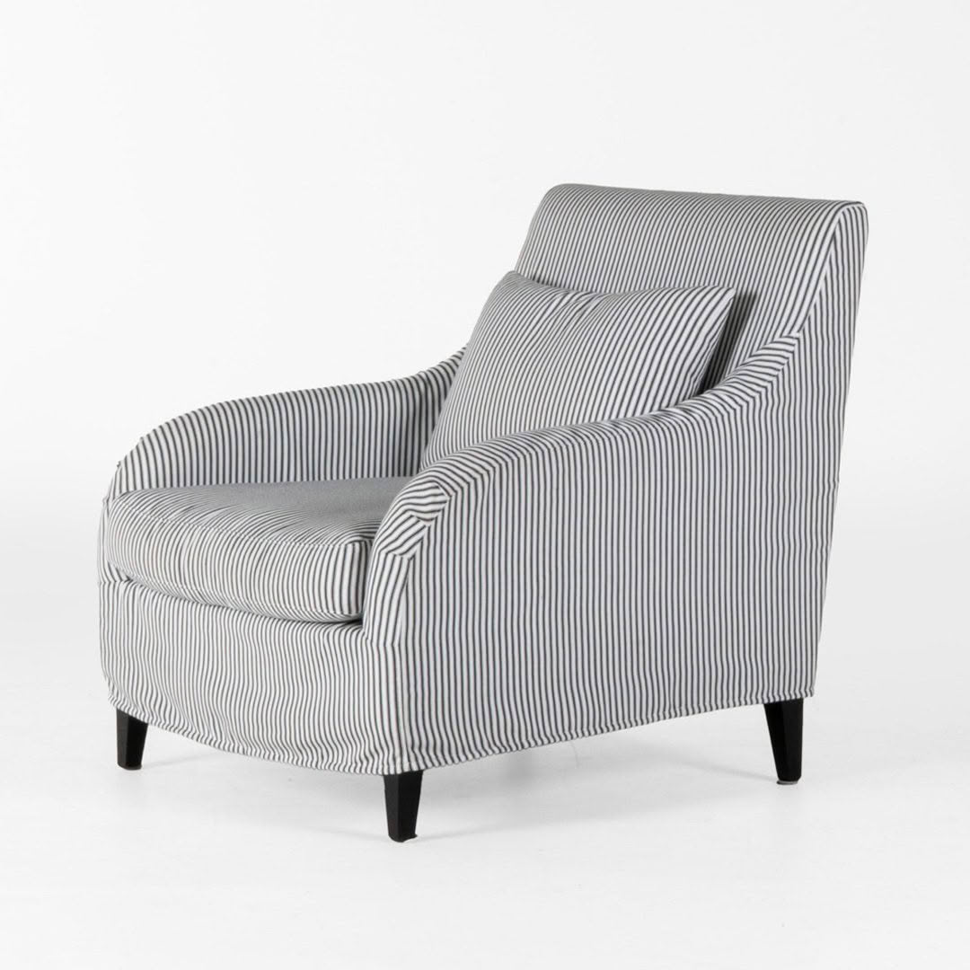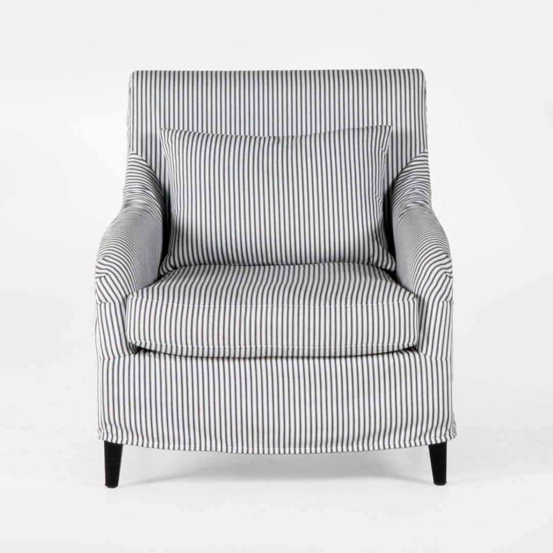 Striped black and white upholstered armchair on white backgroundBlack striped armchair with nailhead trim on white